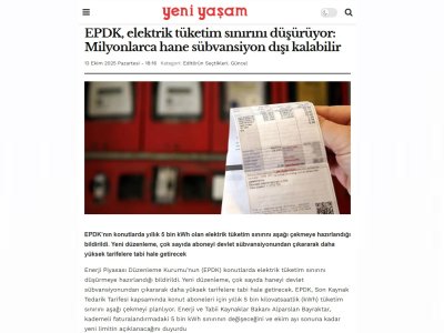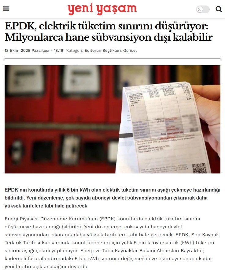 yeniyasamgazetesi9.com Enerji Piyasası Düzenleme Kurumu`nun (EPDK) konutlarda elektrik tüketim sınırını düşürmeye hazırlandığı bildirildi. Yeni düzenleme, çok sayıda haneyi devlet sübvansiyonundan çıkararak daha yüksek tarifelere tabi hale getirecek. EPDK, Son Kaynak Tedarik Tarifesi kapsamında konut aboneleri için yıllık 5 bin kilovatsaatlik (kWh) tüketim sınırını aşağı çekmeyi planlıyor. Enerji ve Tabii Kaynaklar Bakanı Alparslan Bayraktar, kademeli faturalandırmadaki 5 bin kWh sınırının değişeceğini ve ekim ayı sonuna kadar yeni limitin açıklanacağını duyurdu. 1 Şubat 2025`ten bu yana yürürlükte olan sistemde, yıllık tüketimi belirlenen sınırın üzerinde olan aboneler sübvansiyondan yararlanamıyor ve serbest piyasa fiyatlarıyla elektrik kullanıyor. Elektrik Mühendisleri Odası (EMO), dört kişilik bir ailenin asgari tüketiminin aylık yaklaşık 240 kWh olduğunu, kalabalık ailelerde bu miktarın çok daha yüksek olduğunu belirtti. EMO, yeni düzenlemenin enerji maliyetlerini özel sektör lehine yeniden dağıtacağını ve "örtülü bir zam" anlamına geleceğini ifade etti. Sınırın 3 bin kWh`a düşürülmesi gündemde. EMO, bu durumda milyonlarca yurttaşın fatura şokuyla karşılaşacağını, özel şirketlerin kazançlarının artarken halkın cebinden çıkan yükün büyüyeceğini vurguladı.