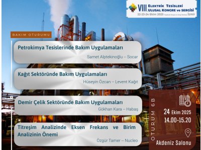 Elektrik Mühendisleri Odası (EMO) adına EMO İzmir Şubesi’nin düzenlediği VIII. Elektrik Tesisleri Ulusal Kongre ve Sergisi`nin (ETUK 2025) programı yayımlandı. Tepekule Kongre ve Sergi Merkezi Akdeniz Salonu`nda 24 Ekim 2025 Cuma günü düzenlenen 6B oturumunda endüstriyel bakım teknolojilerine ilişkin bildiriler sunulacak. Program ayrıntılarına ve kayıt bağlantısına yazımızın devamından ulaşabilirsiniz.