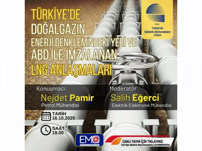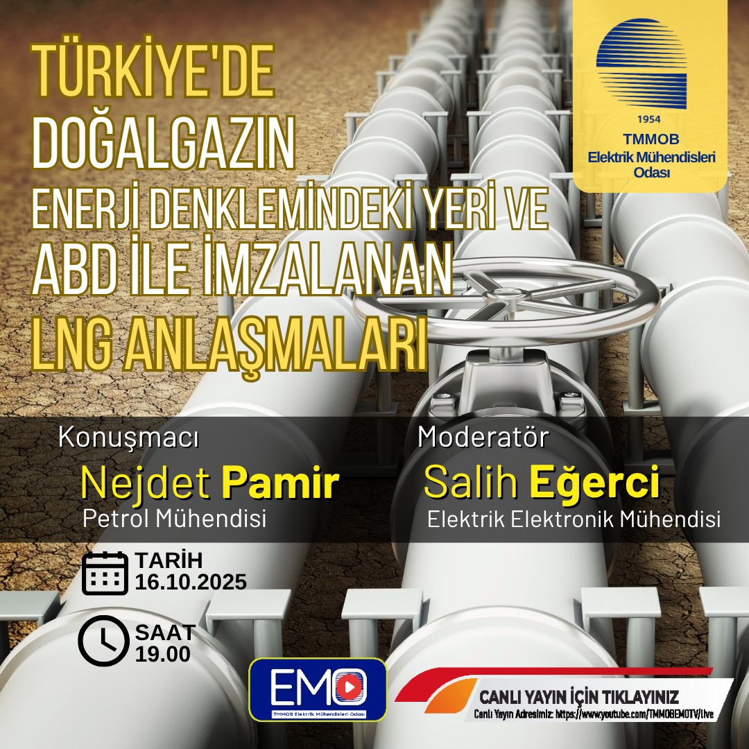 EMO TV’de 16 Ekim 2025 Perşembe günü “Türkiye`de Doğalgazın Enerji Denklemindeki Yeri ve ABD ile İmzalanan LNG Anlaşmaları” başlıklı program gerçekleştirilecektir. Petrol Mühendisi Nejdet Pamir`in konuşmacı olarak katılacağı program, EMO Eskişehir Şubesi Yönetim Kurulu Başkan Yardımcısı Salih Eğerci yönetiminde düzenlenecektir. Saat 19.00’da başlayacak olan yayına Odamızın Youtube kanalı üzerinden sorularınız ve görüşlerinizle canlı katılabilirsiniz.