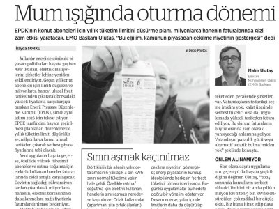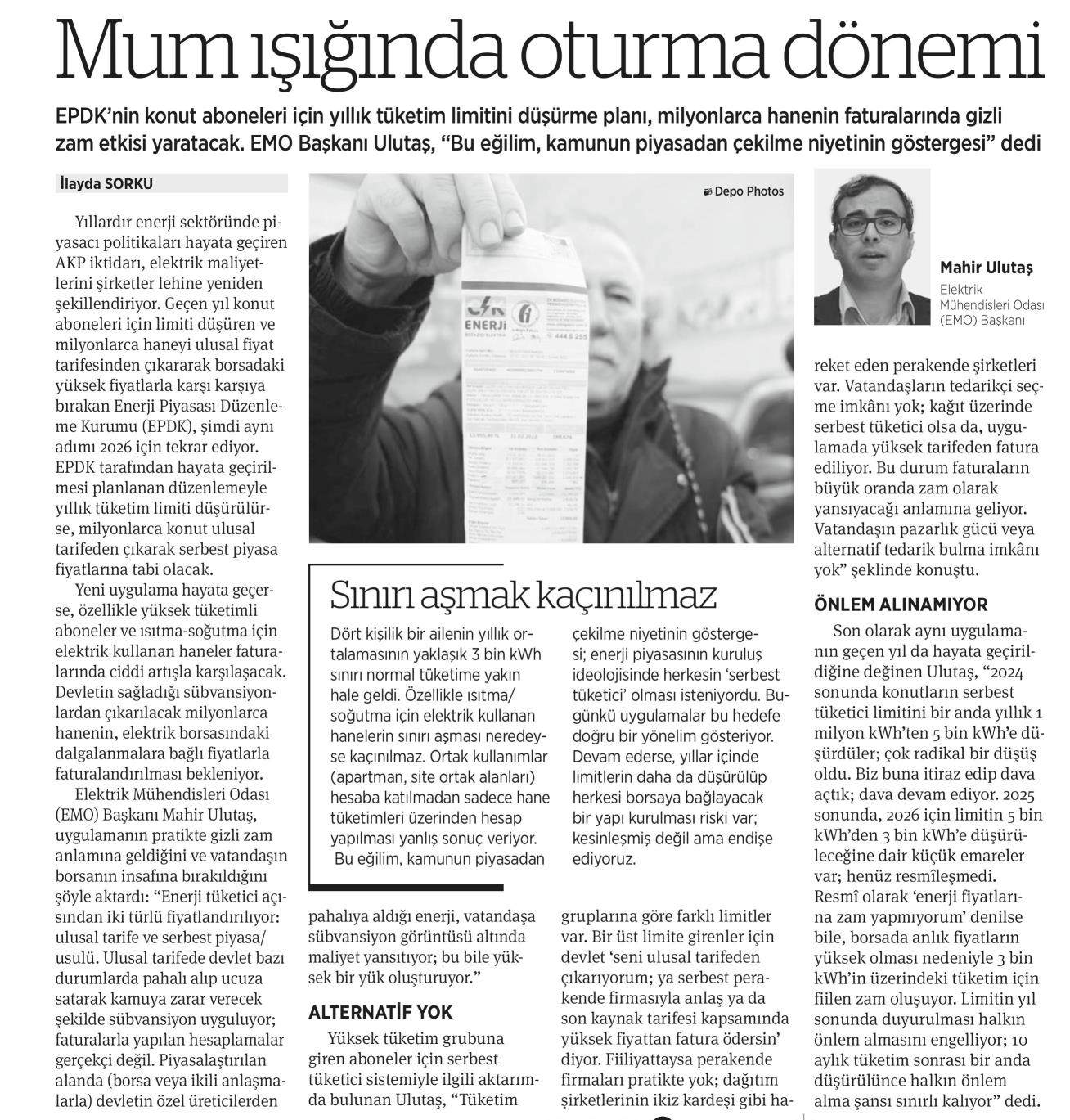 Sınırı aşmak kaçınılmaz. Mum ışığında oturma dönemi. EPDK`nin konut aboneleri için yıllık tüketim limitini düşürme planı, milyonlarca hanenin faturalarında gizli zam etkisi yaratacak. EMO Başkanı Ulutaş, `Bu eğilim, kamunun piyasadan çekilme niyetinin göstergesi` dedi.