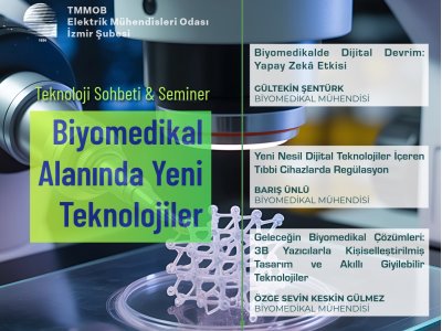 Elektrik Mühendisleri Odası (EMO) İzmir Şubesi, 30 Ekim 2025 Perşembe günü “Biyomedikal Alanında Yeni Teknolojiler” başlıklı bir panel düzenleyecektir. Zeki Demir’in moderatörlüğünde, EMO İzmir Şubesi Hizmet ve Eğitim Merkezi’nde saat 18.00’de başlayacak etkinlikte Gültekin Şentürk, Barış Ünlü ve Özge Sevin Keskin Gülmez sunumlarını gerçekleştirecektir. Etkinliğe ilişkin ayrıntılı bilgilere yazımızın devamından ulaşabilirsiniz.
