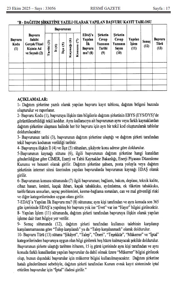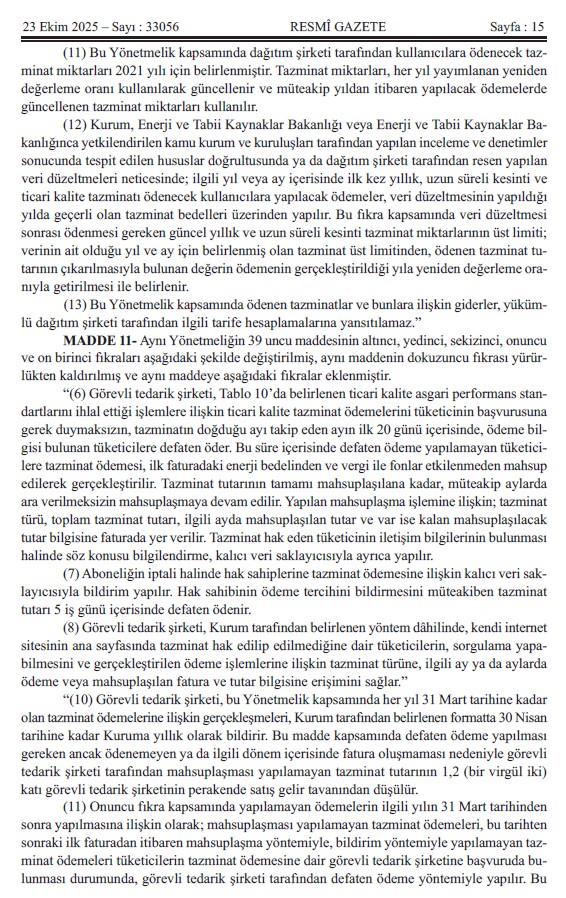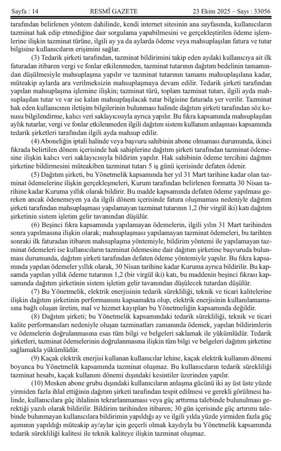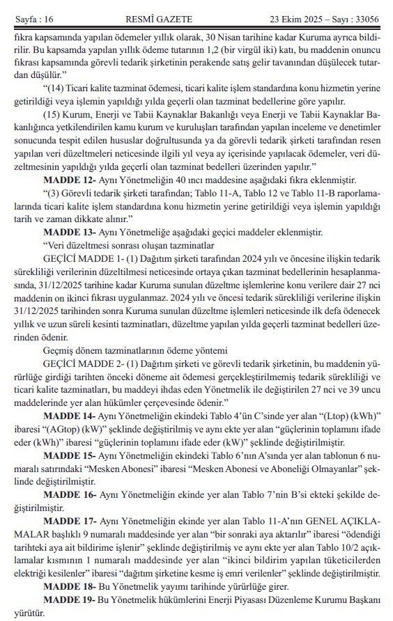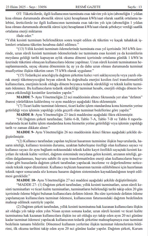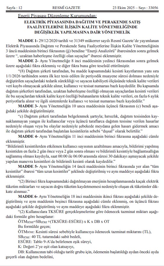 Kıymetli Üyelerimiz, Mevzuat Takip Sistemimiz bilgilendirmesine göre `Elektrik Piyasasında Dağıtım ve Parakende Satış Faaliyetlerine İlişkin Kalite Yönetmeliğinde Değişiklik Yapılmasına Dair Yönetmelik` 23.10.2025 Tarih ve 33056 Sayılı Resmi Gazetede yayımlanmıştır.