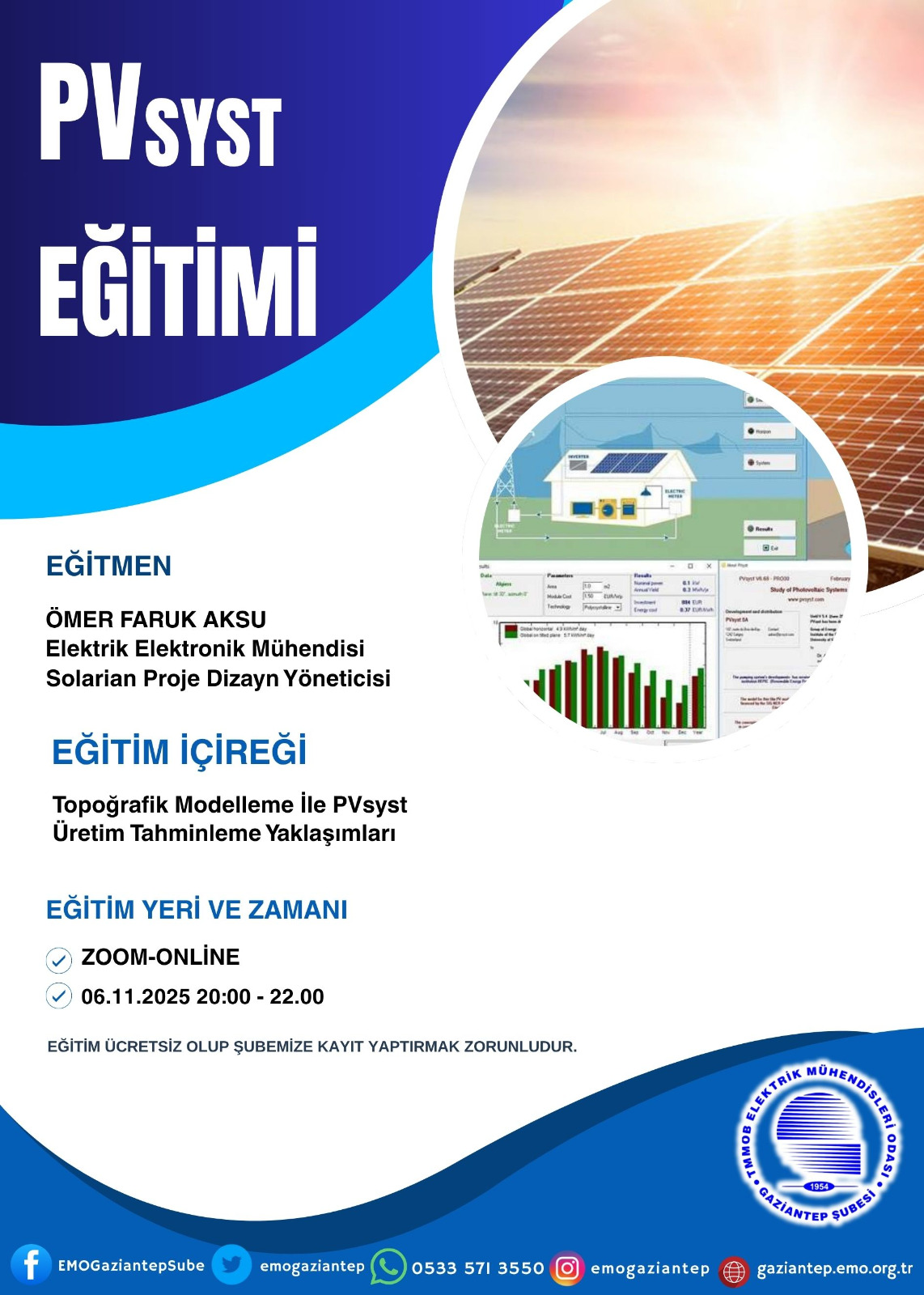 06 Kasım 2025 tarihinde 20:00-22:00 saatleri arasında ZOOM Uygulaması üzerinden online PVSYST Eğitimi düzenlenecektir. Eğitim ücretsiz olup şubemize kayıt yaptırmak zorunludur.