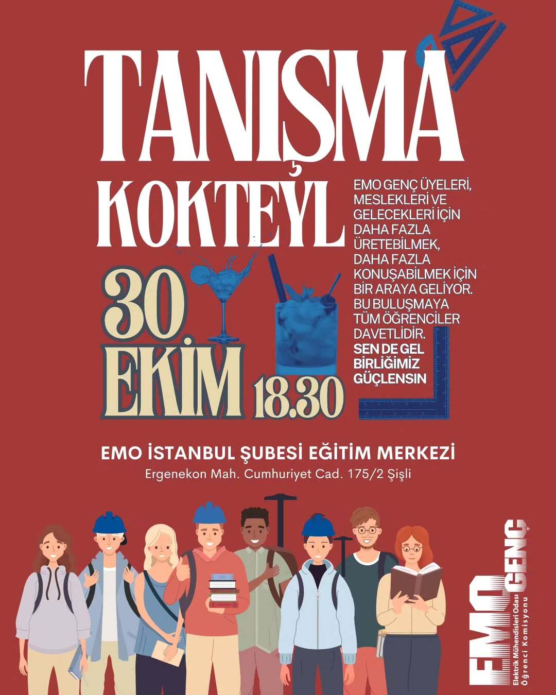 EMO-Genç üyelerimizle Güz Dönemi Tanışma & Kokteyl etkinliği düzenlenecektir. Etkinlik 30 Ekim Perşembe günü saat 18:30‘da EMO İstanbul Şubesi Eğitim salonunda gerçekleşecektir