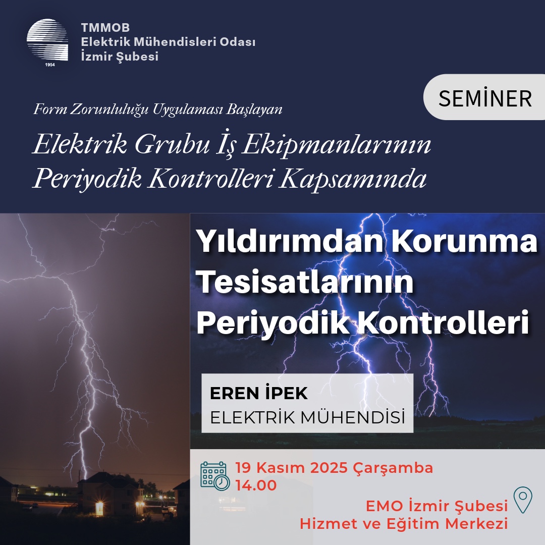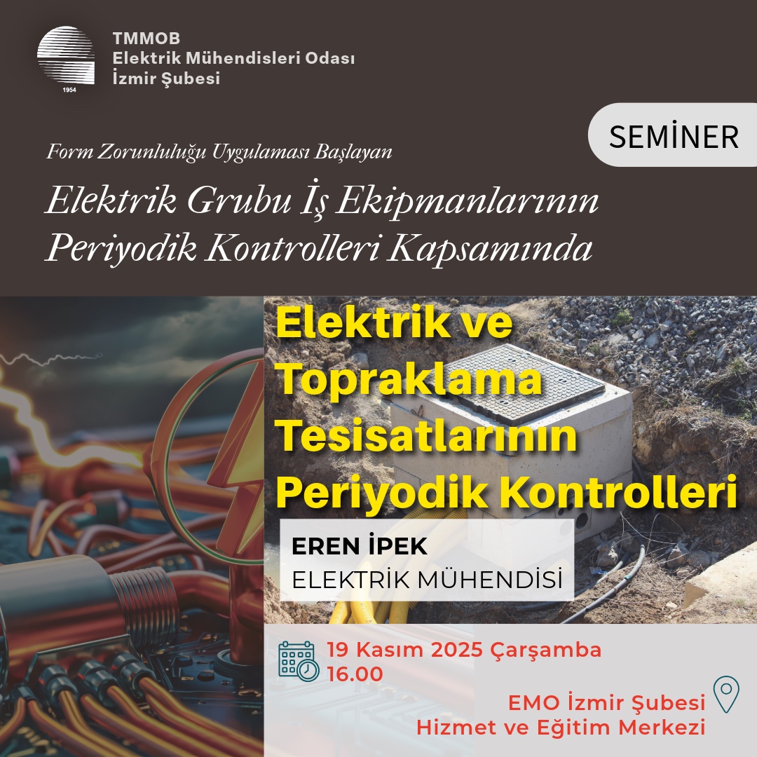Elektrik Mühendisleri Odası (EMO) İzmir Şubesi, form zorunluluğu uygulaması başlayan elektrik grubu iş ekipmanlarının periyodik kontrollerine ilişkin bir seminer dizisi düzenleyecektir. Kasım ayı boyunca gerçekleştirilecek dört seminerde; “Yangın Algılama ve Uyarı Sistemleri”, “Trafo Merkezleri”, “Yıldırımdan Korunma” ve “Elektrik ile Topraklama Tesisatlarının` periyodik kontrolleri konuları ele alınacaktır. Seminer takvimine yazımızın devamından ulaşabilirsiniz.