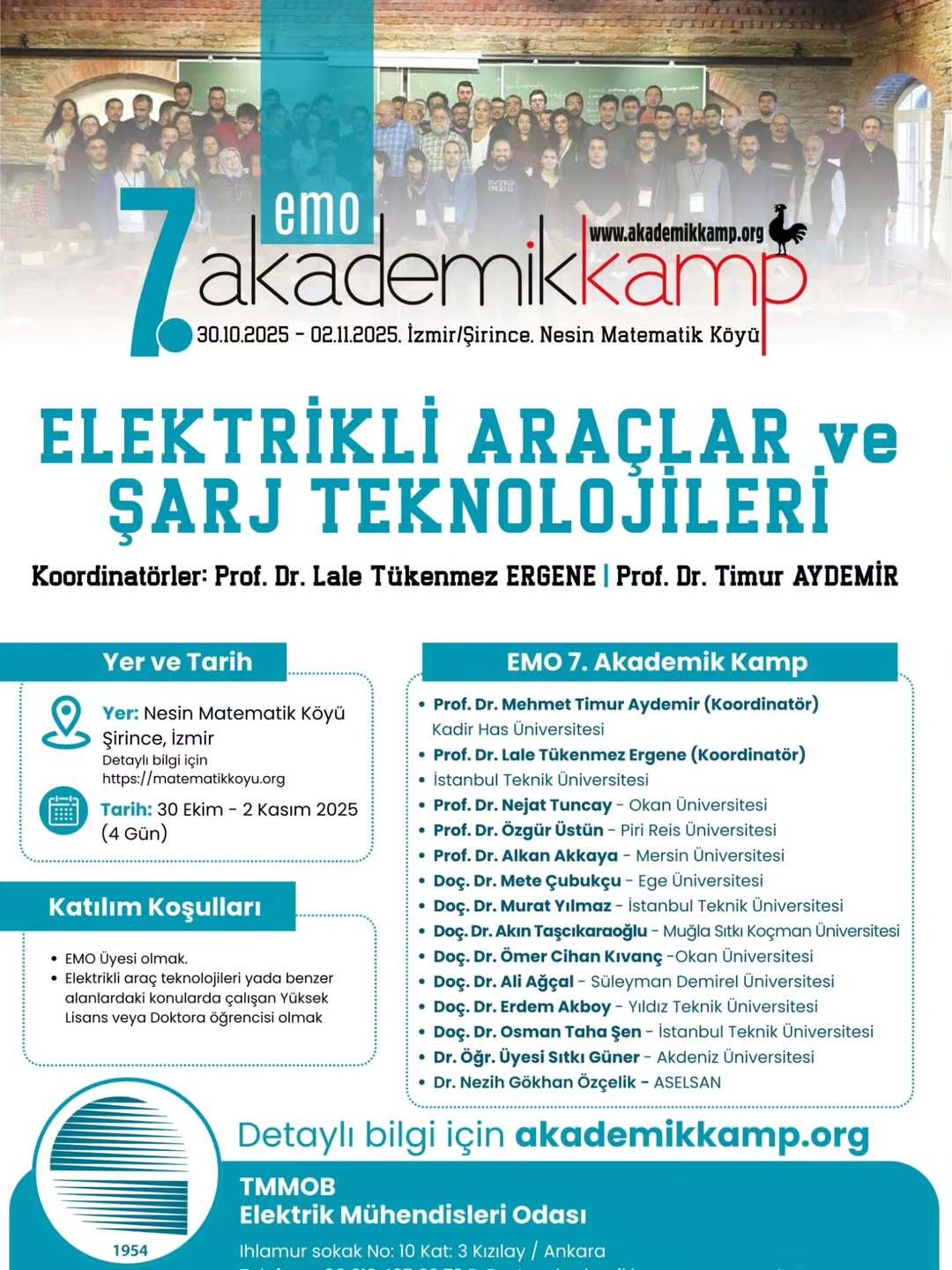 Elektrik Mühendisleri Odası`nın üniversitelerle işbirliği kapsamında 2012 yılından bu yana düzenlemekte olduğu Akademik Kamp`ın yedincisi bu yıl "Elektrikli Araçlar ve Şarj Teknolojileri" temasıyla 30 Ekim 2025- 02 Kasım 2025 tarihlerinde Nesin Matematik Köyü Şirince`de gerçekleştirilecektir.