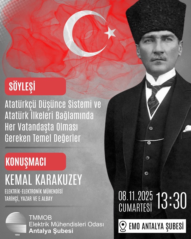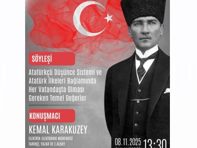 08 Kasım 2025 Cumartesi günü saat 13:30`da Şubemiz seminer salonunda, Tarihçi, Yazar ve Emekli Albay Üyemiz Elektrik-Elektronik Mühendisi Kemal KARAKUZEY`in anlatımıyla `Atatürkçü Düşünce Sistemi ve Atatürk İlkeleri Bağlamında Her Vatandaşta Olması Gereken Temel Değerler` başlıklı bir söyleşi düzenlenecek olup, söyleşiye tüm üyelerimiz davetlidir.