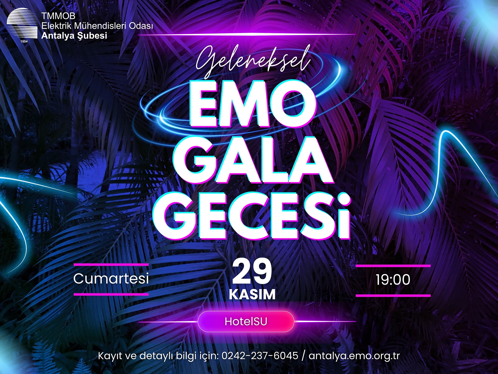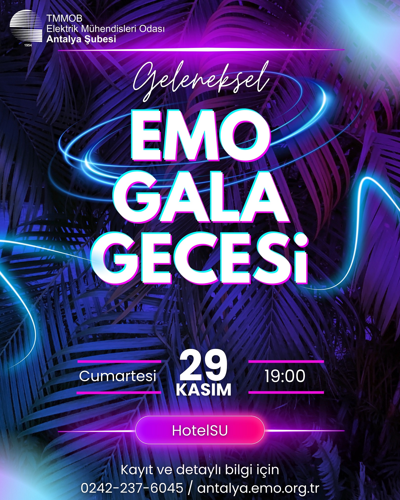 Odamızın 71., Şubemizin 31. Kuruluş yıl dönümünü kutlayacağımız EMO Antalya Şubesi Geleneksel Gecesi 29 Kasım 2025 Cumartesi günü saat 19:00`da Hotel Su’da gerçekleşecektir. Meslekte 25, 40, 50 ve 60. yıllarını geride bırakan üyelerimize plaketlerinin verileceği Geleneksel EMO Gecemizde tüm üyelerimizle bir arada olmaktan mutluluk duyacağız. Geleneksel Gecenin rezervasyonu ve ayrıntılı bilgi için Şubemizle iletişime geçebilir ve etkinlik detaylarına yazımızın devamından ulaşabilirsiniz.