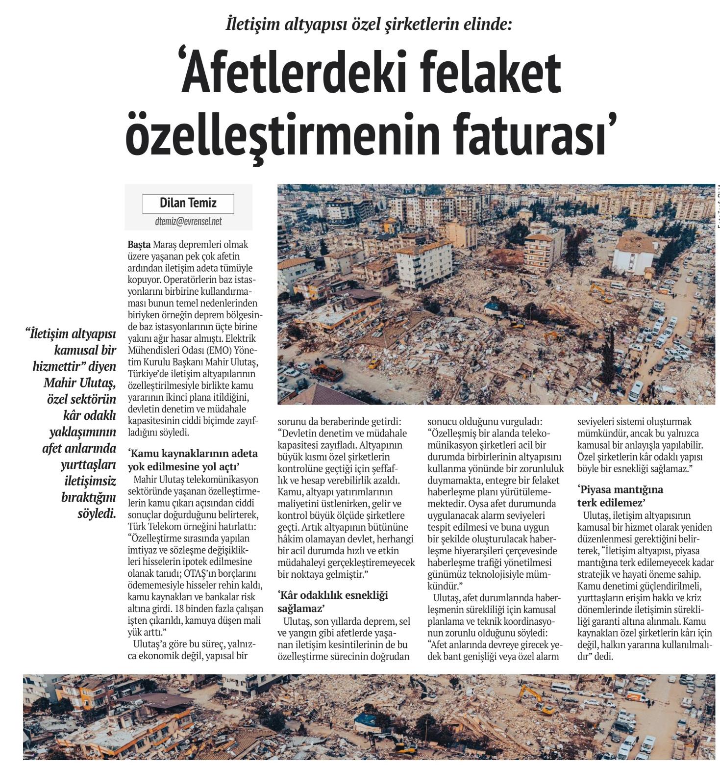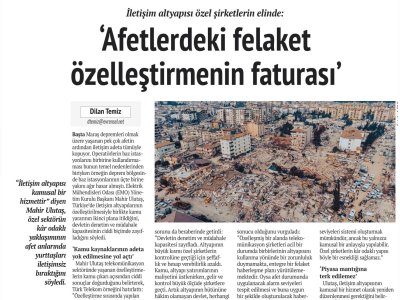 İletişim altyapısı özel şirketlerin elinde: `Afetlerdeki felaket özelleştirmenin faturası` İM `İletişim altyapısı kamusal bir hizmettir` diyen Mahir Ulutaş, özel sektörün kâr odaklı yaklaşımının afet anlarında yurttaşları iletişimsiz bıraktığını söyledi.