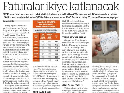 Elektrik faturasına dolaylı zam, Resmi Gazete`de yayınmlanarak yürürlüğe girdi. Ülkede haneler yıllık ortalama 5 bin kWh elektrik tüketirken sübvansiyon sınırı 4 bin kVVh tüketimde kaldı. Ortalama bir hane yüzde 100`e yaklaşan zamla karşı karşıya kalacak. 2,5 milyon abone etkilenecek. EMO Başkanı Ulutaş, `993 lira ve üzerinde olan aboneleri yüzde 99 zam bekliyor` dedi. 2`deFaturalar ikiye katlanacak EPDK, apartman ve konutların ortak elektrik kullanımına yıllık 4 bin kVVh sınırı getirdi. Düzenlemeyle ortalama tüketimdeki hanelerin faturaları %75 ila 99 oranında artacak. EMO Başkanı Ulutaş: Zorlama düzenleme yapılıyor.