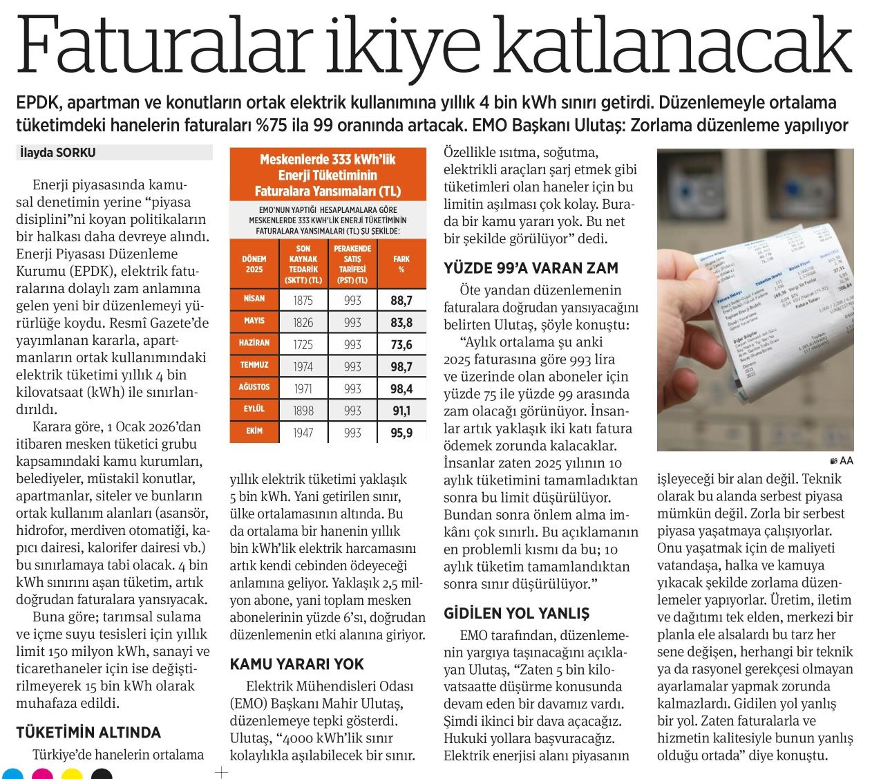 Enerji piyasasında kamusal denetimin yerine "piyasa disiplini"ni koyan politikaların bir halkası daha devreye alındı. Enerji Piyasası Düzenleme Kurumu (EPDK), elektrik faturalarına dolaylı zam anlamına gelen yeni bir düzenlemeyi yürürlüğe koydu. Resmî Gazete‘de yayımlanan kararla, apartmanların ortak kullanımındaki elektrik tüketimi yıllık 4 bin kilovatsaat (kWh) ile sınırlandırıldı. Karara göre, 1 Ocak 2026‘dan itibaren mesken tüketici grubu kapsamındaki kamu kurumları, belediyeler, müstakil konutlar, apartmanlar, siteler ve bunların ortak kullanım alanları (asansör, hidrofor, merdiven otomatiği, kapıcı dairesi, kalorifer dairesi vb.) bu sınırlamaya tabi olacak. 4 bin kWh sınırını aşan tüketim, artık doğrudan faturalara yansıyacak. Buna göre; tarımsal sulama ve içme suyu tesisleri için yıllık limit 150 milyon kWh, sanayi ve ticarethaneler için ise değiştirilmeyerek 15 bin kWh olarak muhafaza edildi. TÜKETİMİN ALTINDA Türkiye‘de hanelerin ortalama yıllık elektrik tüketimi yaklaşık 5 bin kWh. Yani getirilen sınır, ülke ortalamasının altında. Bu da ortalama bir hanenin yıllık bin kVVh‘lik elektrik harcamasını artık kendi cebinden ödeyeceği anlamına geliyor. Yaklaşık 2,5 milyon abone, yani toplam mesken abonelerinin yüzde 6‘sı, doğrudan düzenlemenin etki alanına giriyor. KAMU YARARI YOK Elektrik Mühendisleri Odası (EMO) Başkanı Mahir Ulutaş, düzenlemeye tepki gösterdi. Ulutaş, "4000 kVVh‘lik sınır kolaylıkla aşılabilecek bir sınır. Özellikle ısıtma, soğutma, elektrikli araçları şarj etmek gibi tüketimleri olan haneler için bu limitin aşılması çok kolay. Burada bir kamu yararı yok. Bu net bir şekilde görülüyor" dedi. YÜZDE 99‘A VARAN ZAM Öte yandan düzenlemenin faturalara doğrudan yansıyacağını belirten Ulutaş, şöyle konuştu: "Aylık ortalama şu anki 2025 faturasına göre 993 lira ve üzerinde olan aboneler için yüzde 75 ile yüzde 99 arasında zam olacağı görünüyor. İnsanlar artık yaklaşık iki katı fatura ödemek zorunda kalacaklar. İnsanlar zaten 2025 yılının 10 aylık tüketimini tamamladıktan sonra bu limit düşürülüyor. Bundan sonra önlem alma imkânı çok sınırlı. Bu açıklamanın en problemli kısmı da bu; 10 aylık tüketim tamamlandıktan sonra sınır düşürülüyor." GİDİLEN YOL YANLIŞ EMO tarafından, düzenlemenin yargıya taşınacağını açıklayan Ulutaş, "Zaten 5 bin kilovatsaatte düşürme konusunda devam eden bir davamız vardı. Şimdi ikinci bir dava açacağız. Hukuki yollara başvuracağız. Elektrik enerjisi alanı piyasanın m AA işleyeceği bir alan değil. Teknik olarak bu alanda serbest piyasa mümkün değil. Zorla bir serbest piyasa yaşatmaya çalışıyorlar. Onu yaşatmak için de maliyeti vatandaşa, halka ve kamuya yıkacak şekilde zorlama düzenlemeler yapıyorlar. Üretim, iletim ve dağıtımı tek elden, merkezi bir planla ele alsalardı bu tarz her sene değişen, herhangi bir teknik ya da rasyonel gerekçesi olmayan ayarlamalar yapmak zorunda kalmazlardı. Gidilen yol yanlış bir yol. Zaten faturalarla ve hizmetin kalitesiyle bunun yanlış olduğu ortada" diye konuştu.
