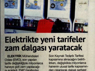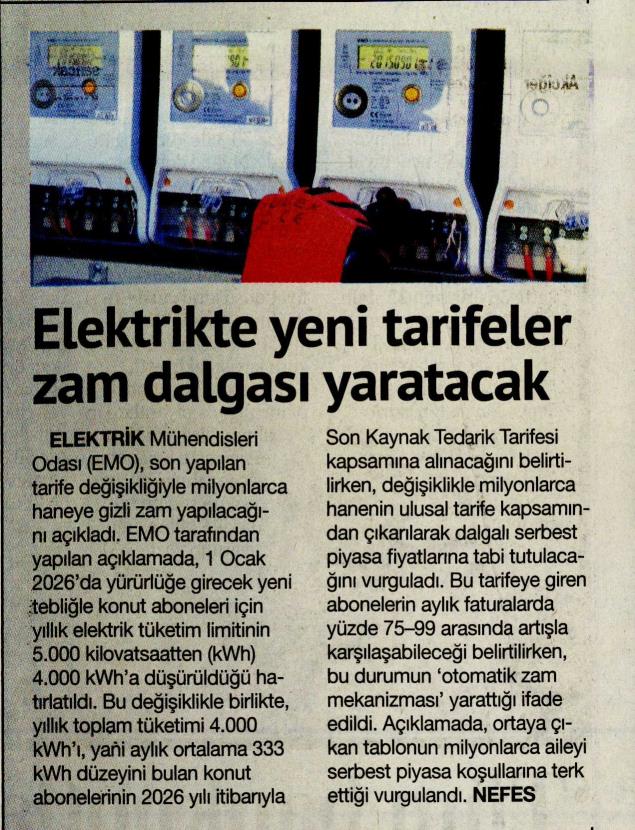 ELEKTRİK Mühendisleri Odası (EMO), son yapılan tarife değişikliğiyle milyonlarca haneye gizli zam yapılacağını açıkladı. EMO tarafından yapılan açıklamada, 1 Ocak 2026`da yürürlüğe girecek yeni Jebliğle konut aboneleri için yıllık elektrik tüketim limitinin 5.000 kilovatsaatten (kWh) 4.000 kWh`a düşürüldüğü hatırlatıldı.