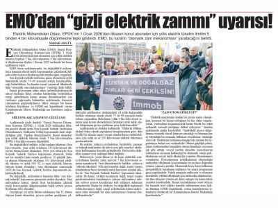 ZAM OTOMATİKLEŞİR Kamusal hizmete dikkat çekilen açıklamada "Elektrik enerjisinin sıradan bir piyasa metaı olmadığını, kamusal bir hizmet olduğunu bir kez daha vurgulayarak, yurttaşların taşınamayacak kadar büyük bir yükü sırtlamak zorunda kaldığına dikkat çekiyoruz." Denilen açıklamada şunlar kaydedildi: "Spekülatif piyasa dalgalarının otomatik olarak faturaya yansıdığı ve faturanın her ay büyüdüğü bir ortamda, hükümet sözcülerine ‘elektriğe zam yok‘ ifadelerini kullanma olanağı bile yaratan bu uygulamaya derhal son verilmelidir. Ödeme güçlüğü çeken, fatura korkusundan karanlıkta oturan hanelerin sayısının çığ gibi arttığı; sosyal yardım almadan yaşayamayan yurttaşların sayısının katlandığı bu dönemde, enerji politikalarının sosyal tarife ilkeleriyle yeniden düzenlenmesi zorunludur. Piyasalaştırma politikalarının oluşturduğu maliyetleri düşürmek için kamunun bir an önce doğrudan yatırım yapması gerekir. Ekonomik krize karşı kalkınma perspektifiyle hazırlanan toplumcu bir enerji programına geçiş yapılmalıdır. Pahalı enerjilim enflasyon ve ekonomi üzerindeki yükünü düşülmek için üretimden dağıtım kadar tüm süreçleri yönetecek dikey entegre bir kamu tekeli yemden kurulmalıdır. Kamu kaynaklarının sonu belirsiz bir biçimde özel sektöre transfer edilmesinin aracı hafine dönüşen EPDK kapatılarak, yerine kamulaştırma işlemlerini yürütecek bir Kamulaştırma İdaresi Başkanlığı kurulmalıdır."