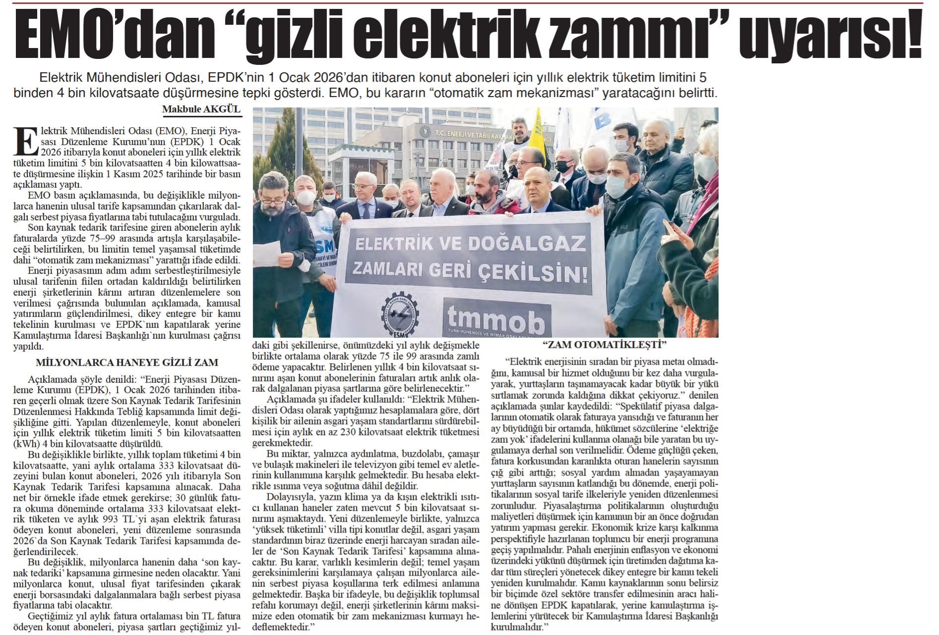 Elektrik Mühendisleri Odası (EMO), Enerji Piyasası Düzenleme Kurumu‘nun (EPDK) 1 Ocak 2026 itibarıyla konut aboneleri için yıllık elektrik tüketim limitini 5 bin kilovatsaatten 4 bin kilovatsaate düşülmesine ilişkin 1 Kasım 2025 tarihinde bir basın açıklaması yaptı. EMO basın açıklamasında, bu değişiklikle milyonlarca hanenin ulusal tarife kapsamından çıkarılarak dalgalı serbest piyasa fiyatlarına tabi tutulacağını vurguladı. Son kaynak tedarik tarifesine göre abonelerin aylık faturalarda yüzde 75—99 arasında artışla karşılaşabileceği belirtilirken, bu limitin temel yaşamsal tüketimde dahi "otomatik zam mekanizması" yarattığı ifade edildi. Enerji piyasasının adım adım serbestleştirilmesiyle ulusal tarifenin fiilen ortadan kaldırıldığı belirtilirken enerji şirketlerinin kârını artıran düzenlemelere son verilmesi çağrısında bulunulan açıklamada, kamusal yararın güçlendirilmesi dikey entegre bir kamu tekelinin kurulması ve EPDK‘nın kapatılarak yerine Kamulaştırma İdaresi Başkanlığı‘nın kurulması çağrısı yapıldı.