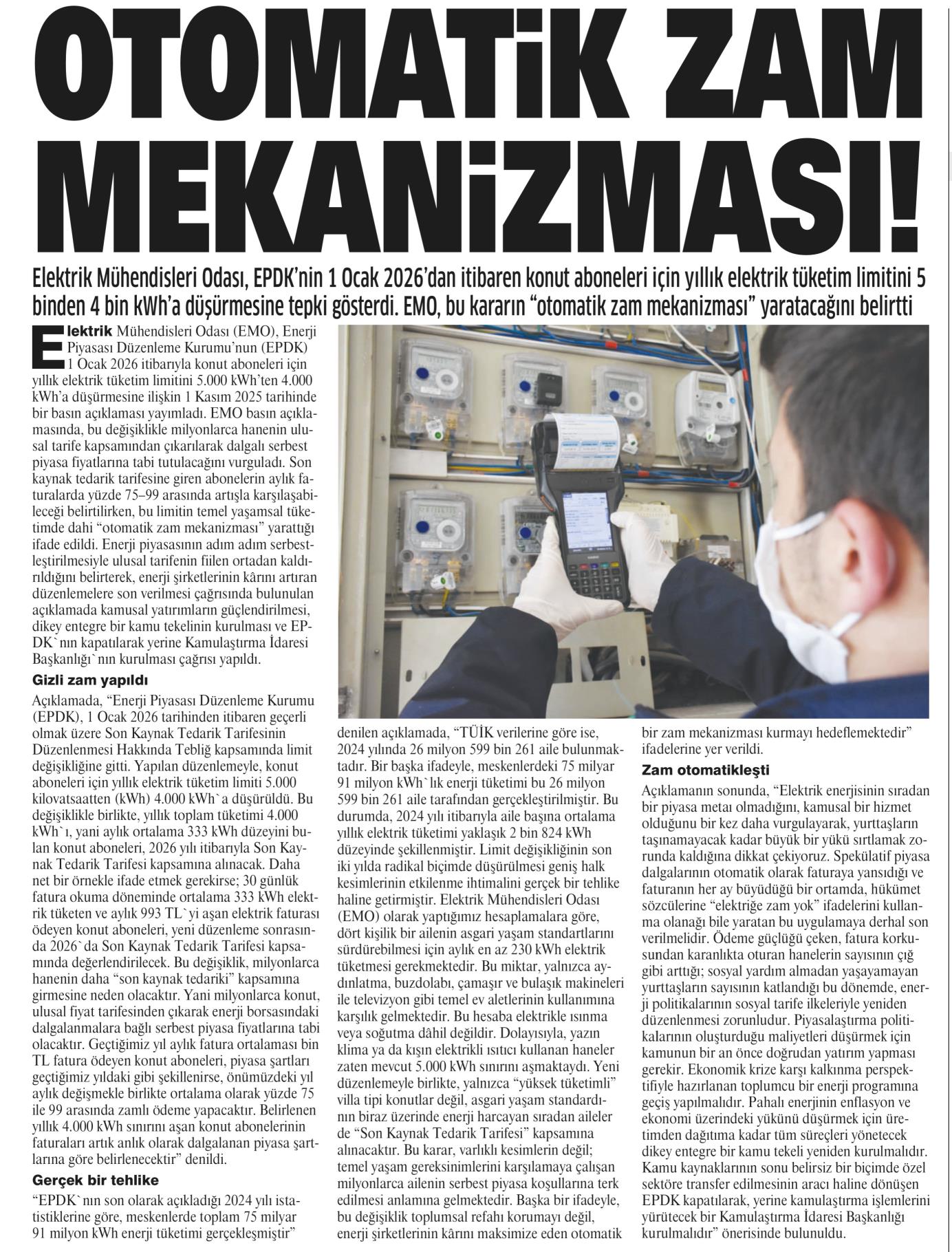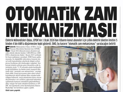 Elektrik Mühendisleri Odası, EPDK`nin 1 Ocak 2026`dan itibaren konut aboneleri için yıllık elektrik tüketim limitini 5 binden 4 bin kWh`a düşürmesine tepki gösterdi. EMO bu kararın `otomatik zam mekanizması` yaratacağını belirtti. EMO basın açıklamasında, bu değişiklikle milyonlarca hanenin ulusal tarife kapsamından çıkarılarak dalgalı serbest piyasa fiyatlarına tabi tutulacağını vurguladı.