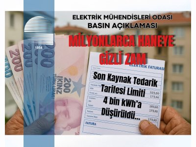 Açıklamanın tam metnine haberimizin devamından ulaşabilirsiniz. ELEKTRİK MÜHENDİSLERİ ODASI BASIN AÇIKLAMASI Son Kaynak Tedarik Tarifesi Limiti 4 bin kWh‘a Düşürüldü MİLYONLARCA HANEYE GİZLİ ZAM Enerji Piyasası Düzenleme Kurumu (EPDK), 1 Ocak 2026 tarihinden itibaren geçerli olmak üzere Son Kaynak Tedarik Tarifesinin Düzenlenmesi Hakkında Tebliğ kapsamında limit değişikliğine gitti. Yapılan düzenlemeyle, konut aboneleri için yıllık elektrik tüketim limiti 5.000 kilovatsaatten (kWh) 4.000 kWh`a düşürüldü.