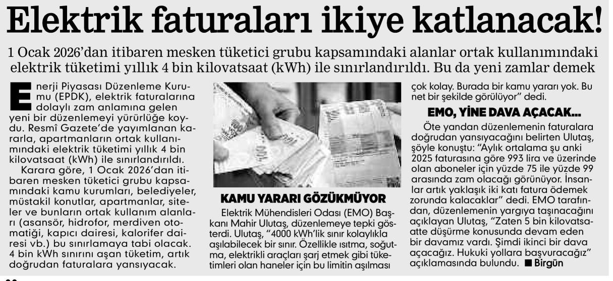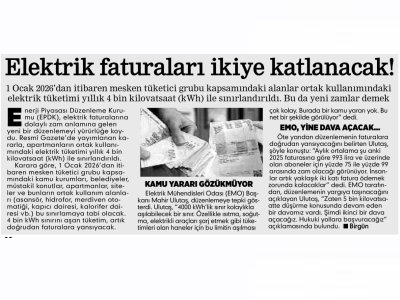 Enerji Piyasası Düzenleme Kurumu (EPDK), elektrik faturalarına dolaylı zam anlamına gelen yeni bir düzenlemeyi yürürlüğe koydu. Resmî Gazete‘de yayımlanan kararla, apartmanların ortak kullanımındaki elektrik tüketimi yıllık 4 bin kilovatsaat (kVVh) ile sınırlandırıldı. Karara göre, 1 Ocak 2026‘dan itibaren mesken tüketici grubu kapsamındaki kamu kurumları, belediyeler, müstakil konutlar, apartmanlar, siteler ve bunların ortak kullanım alanları (asansör, hidrofor, merdiven otomatiği, kapıcı dairesi, kalorifer dairesi vb.) bu sınırlamaya tabi olacak. 4 bin kVVh sınırını aşan tüketim, artık doğrudan faturalara yansıyacak. KAMU YARARI GÖZÜKMÜYOR Elektrik Mühendisleri Odası (EMO) Başkanı Mahir Ulutaş, düzenlemeye tepki gösterdi. Ulutaş, "4000 kVVh‘lik sınır kolaylıkla aşılabilecek bir sınır. Özellikle ısıtma, soğutma, elektrikli araçları şarj etmek gibi tüketimleri olan haneler için bu limitin aşılması çok kolay. Burada bir kamu yararı yok. Bu net bir şekilde görülüyor" dedi. EMO, YİNE DAVA AÇACAK... Öte yandan düzenlemenin faturalara doğrudan yansıyacağını belirten Ulutaş, şöyle konuştu: "Aylık ortalama şu anki 2025 faturasına göre 993 lira ve üzerinde olan aboneler için yüzde 75 ile yüzde 99 arasında zam olacağı görünüyor. İnsanlar artık yaklaşık iki katı fatura ödemek zorunda kalacaklar" dedi. EMO tarafından, düzenlemenin yargıya taşınacağını açıklayan Ulutaş, "Zaten 5 bin kilovatsaatte düşürme konusunda devam eden bir davamız vardı. Şimdi ikinci bir dava açacağız. Hukuki yollara başvuracağız" açıklamasında bulundu.