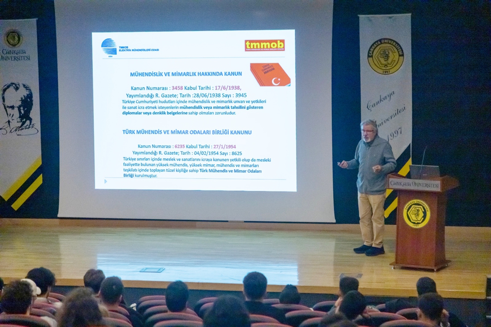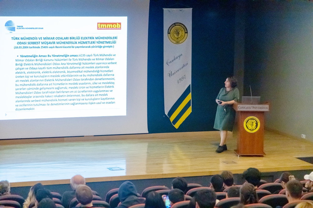 Çankaya Üniversitesi Elektrik Elektronik Mühendisliği Bölüm Başkanlığı`nın daveti üzerine, 3 Kasım 2025 günü üniversite dışı kuruluşlara ayrılan zaman diliminde EMO Yönetim Kurulu Üyesi Ramazan Pektaş ve EMO Ankara Şubesi Teknik Görevlisi Eylem Selçuk Demir, öğrencilerle bir araya geldi.