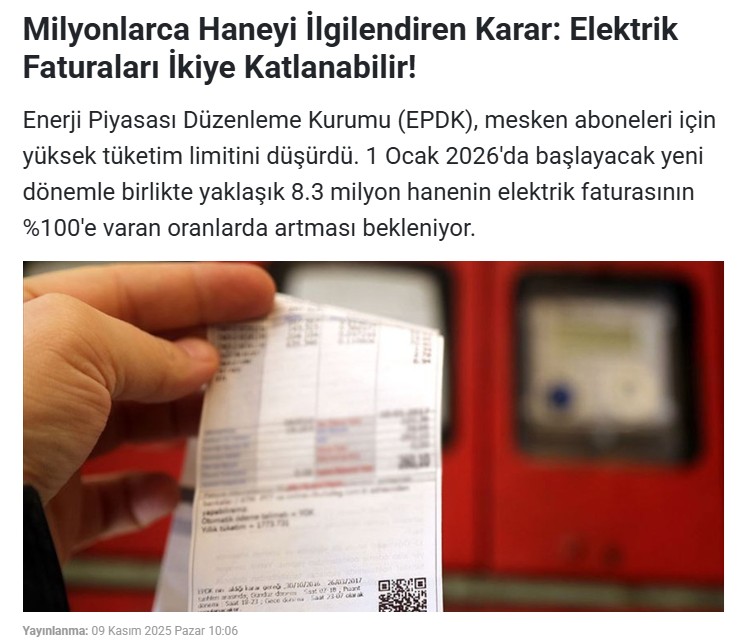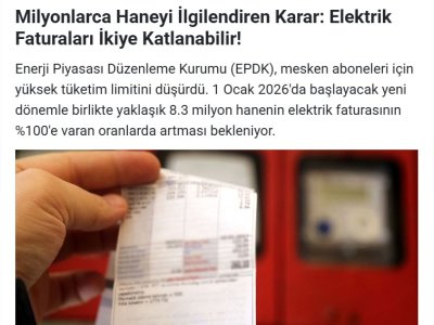 Enerji Piyasası Düzenleme Kurumu (EPDK), mesken aboneleri için yüksek tüketim limitini düşürdü. 1 Ocak 2026`da başlayacak yeni dönemle birlikte yaklaşık 8.3 milyon hanenin elektrik faturasının %100`e varan oranlarda artması bekleniyor.