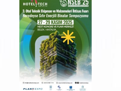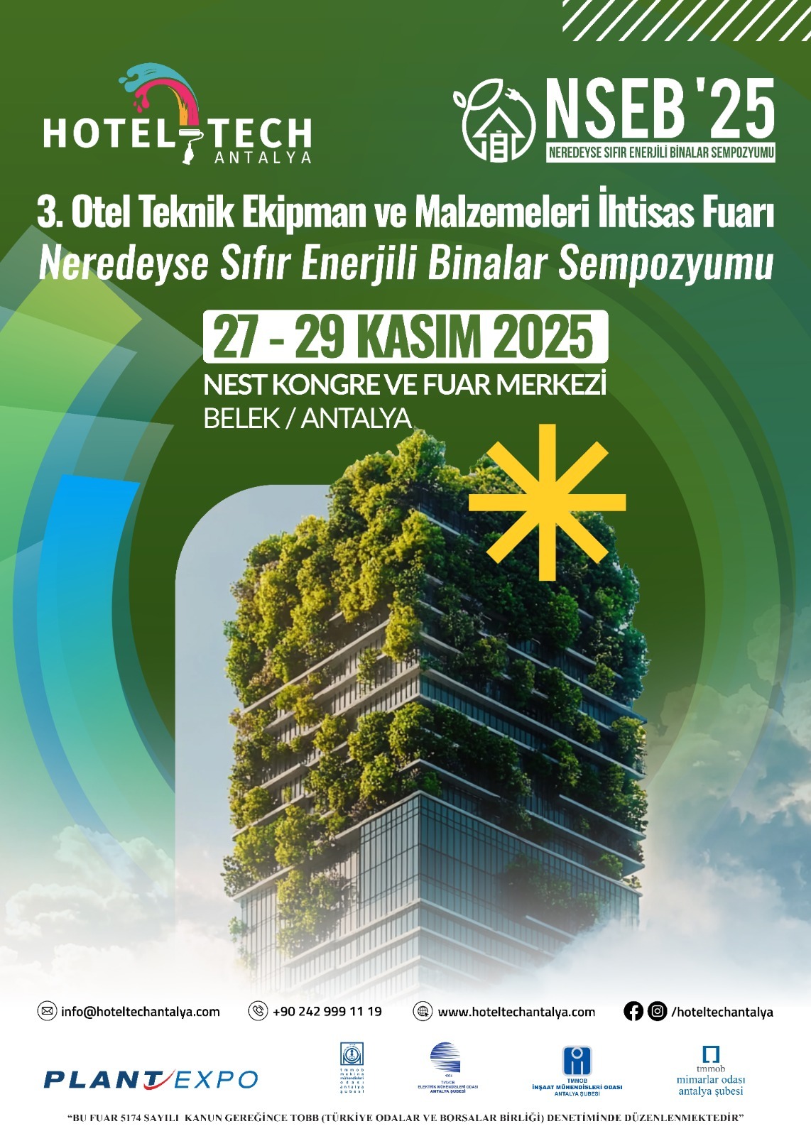 TMMOB Elektrik Mühendisleri Odası, İnşaat Mühendisleri Odası, Makina Mühendisleri Odası ve Mimarlar Odası Antalya Şubeleri ile PLAN-T Fuarcılık tarafından, 27-28-29 Kasım 2025 tarihlerinde Antalya Belek’te Nest Kongre ve Fuar Merkezi’nde “3. Hotel Tech Antalya - Otel Teknik Ekipman ve Malzemeleri İhtisas Fuarı” kapsamında, yerel bazda “Neredeyse Sıfır Enerjili Bina” Sempozyumu gerçekleştirilecek. Sempozyumu ve fuarı ziyaret etmek isteyen üyelerimiz, sempozyum programına, fuar tanıtım broşürüne ve detaylı bilgiyi yazımızın devamında bulabilirler.