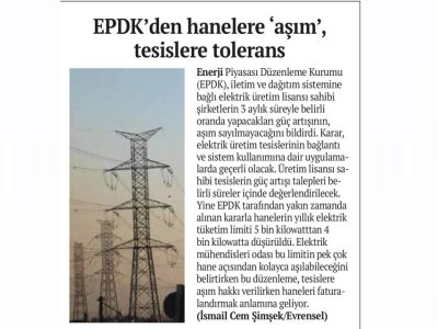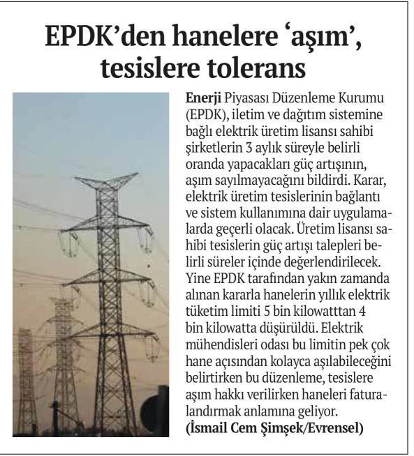 EPDK‘den hanelere ‘aşım‘, tesislere tolerans Enerji Piyasası Düzenleme Kurumu (EPDK), iletim ve dağıtım sistemine bağlı elektrik üretim lisansı sahibi şirketlerin 3 aylık süreyle belirli oranda yapacaklan güç artışının, aşım sayılmayacağını bildirdi. Karar, elektrik üretim tesislerinin bağlantı ve sistem kullanımına dair uygulamalarda geçerli olacak. Üretim lisansı sahibi tesislerin güç artışı talepleri belirli süreler içinde değerlendirilecek. Yine EPDK tarafından yakın zamanda alman kararla hanelerin yıllık elektrik tüketim limiti 5 bin kilowatttan 4 bin kilowatta düşürüldü. Elektrik Mühendisleri Odası bu limitin pek çok hane açısından kolayca aşılabileceğini belirtirken bu düzenleme, tesislere aşım hakkı verilirken haneleri faturalandırmak anlamına geliyor. (İsmail Cem Şimşek/Evrensel)