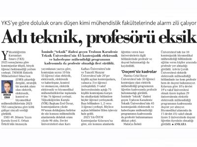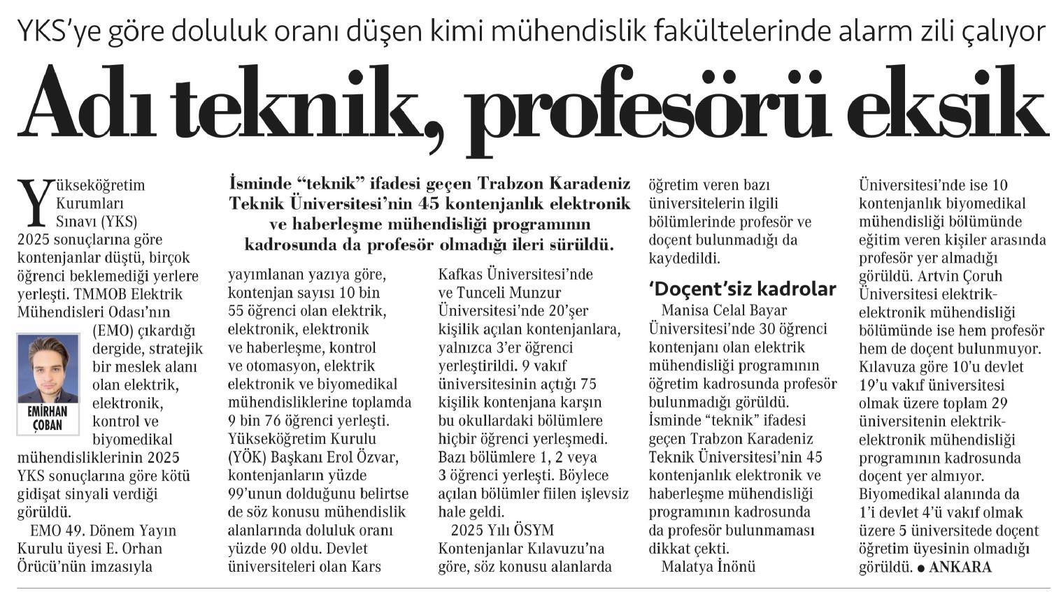 Yükseköğretim Kurumlan Sınavı (YKS) 2025 sonuçlarına göre kontenjanlar düştü, birçok öğrenci beklemediği yerlere yerleşti. TMMOB Elektrik Mühendisleri Odası‘nın (EMO) çıkardığı dergide, stratejik bir meslek alanı olan elektrik, elektronik, kontrol ve biyomedikal mühendisliklerinin 2025 YKS sonuçlarına göre kötü gidişat sinyali verdiği görüldü. EMO 49. Dönem Yayın Kurulu üyesi E. Orhan Örücü‘nün imzasıyla İsminde "teknik" ifadesi geçen Trabzon Karadeniz Teknik Üniversitesi‘nin 45 kontenjanlık elektronik ve haberleşme mühendisliği programının kadrosunda da profesör olmadığı deri sürüldü. yayımlanan yazıya göre, kontenjan sayısı 10 bin 55 öğrenci olan elektrik, elektronik, elektronik ve haberleşme, kontrol ve otomasyon, elektrik elektronik ve biyomedikal mühendisliklerine toplamda 9 bin 76 öğrenci yerleşti. Yükseköğretim Kurulu (YÖK) Başkanı Erol Özvar, kontenjanların yüzde 99‘unun dolduğunu belirtse de söz konusu mühendislik alanlarında doluluk oranı yüzde 90 oldu. Devlet üniversiteleri olan Kars Kafkas Üniversitesi‘nde ve Tunceli Munzur Üniversitesi‘nde 20‘şer kişilik açılan kontenjanlara, yalnızca 3‘er öğrenci yerleştirildi. 9 vakıf üniversitesinin açtığı 75 kişilik kontenjana karşın bu okullardaki bölümlere hiçbir öğrenci yerleşmedi. Bazı bölümlere 1, 2 veya 3 öğrenci yerleşti. Böylece açılan bölümler fiilen işlevsiz hale geldi. 2025 Yılı ÖSYM Kontenjanlar Kılavuzu‘na göre, söz konusu alanlarda öğretim veren bazı üniversitelerin ilgili bölümlerinde profesör ve doçent bulunmadığı da kaydedildi.