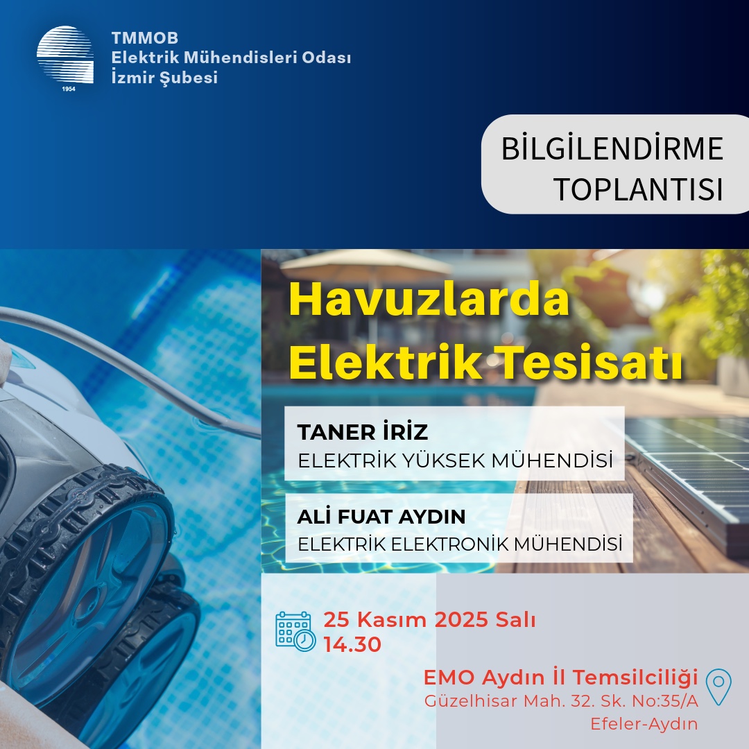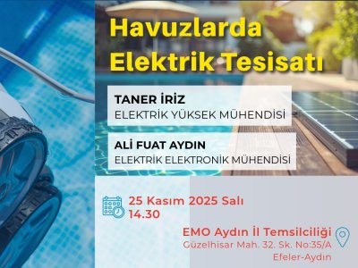 Elektrik Mühendisleri Odası (EMO) İzmir Şubesi, EMO Aydın İl Temsilciliği`nde Taner İriz ve Ali Fuat Aydın’ın sunumlarıyla 25 Kasım 2025 Salı günü saat 14.30’da `Havuzlarda Elektrik Tesisatı` başlıklı seminer düzenleyecektir.