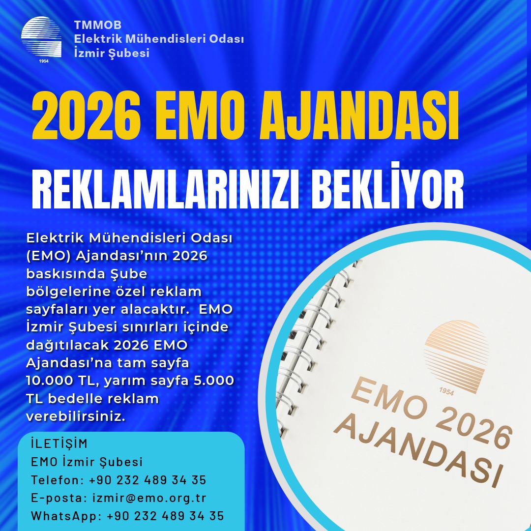 Elektrik Mühendisleri Odası (EMO) Ajandası’nın 2026 baskısında, şube bölgelerine özel reklam sayfaları yer alacaktır. EMO İzmir Şubesi sınırları içinde kalan İzmir, Aydın ve Manisa illerindeki EMO üyelerine ulaştırılacak EMO Ajandası’na bölgesel reklam verebilirsiniz. Ayrıntılı bilgi ve reklam bedellerine yazımızın devamında ulaşabilirsiniz.