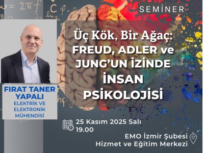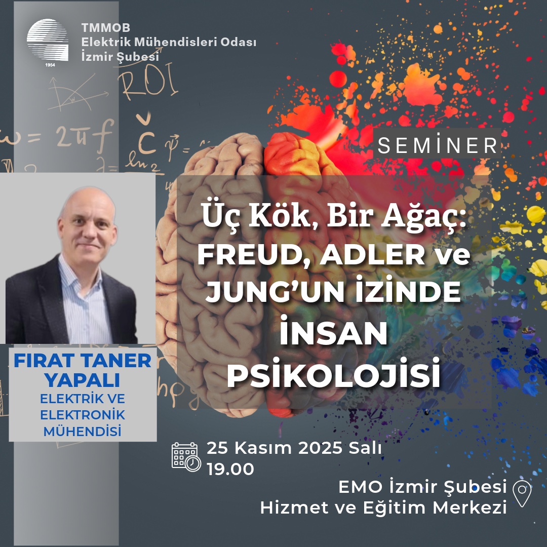 Elektrik Mühendisleri Odası (EMO) İzmir Şubesi, 25 Kasım 2025 Salı günü Hizmet ve Eğitim Merkezi’nde saat 19.00’da Elektrik ve Elektronik Mühendisi Fırat Taner Yapalı`nın sunumuyla `Üç Kök, Bir Ağaç: Freud, Adler ve Jung’un İzinde İnsan Psikolojisi` başlıklı seminer düzenleyecektir.
