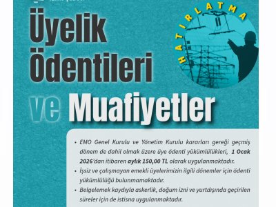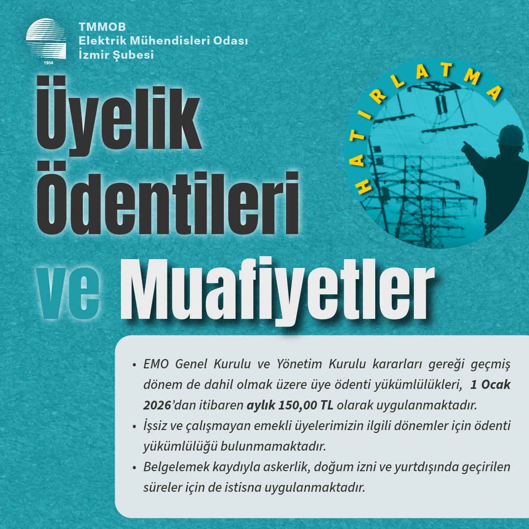 26-27 Nisan 2024 tarihlerinde gerçekleştirilen Elektrik Mühendisleri Odası (EMO) 49. Olağan Genel Kurulu`nda alınan kararla 2026 yılı için üyelik ödenti bedeli aylık 150 TL olarak belirlenmiştir. Geçmişe dönük üyelik ödentileri, ödemenin yapıldığı dönemdeki miktar baz alınarak güncellenerek, hesaplanmaktadır. 1 Ocak 2025‘ten itibaren aylık 100.00 TL olarak uygulanan üyelik ödentisi miktarı, 1 Ocak 2026‘den itibaren 150.00 TL olarak güncellenecektir. 1 Ocak 2026 itibarıyla geçmiş yıllara ilişkin bedeller de aylık 150.00 TL üzerinden hesaplanacaktır. Artıştan etkilenmemek için üyelik ödentisi borcunuzu 2025 yıllı sonuna kadar ödeyebilirsiniz.