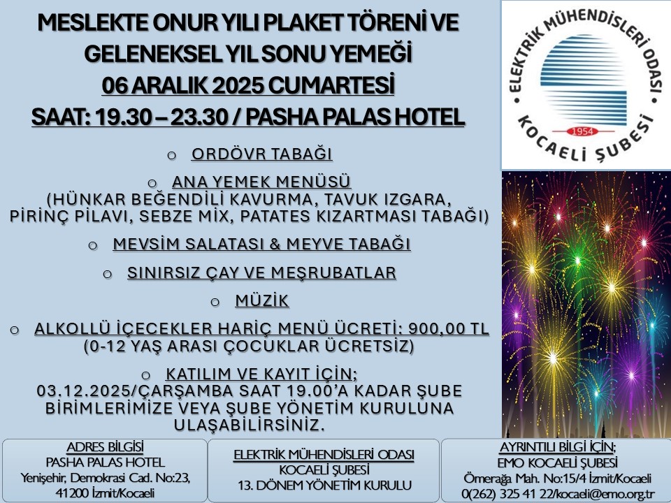 Yemek fiyatımız alkollü içecekler hariç kişi başı 900 TL, 0-12 yaş çocuk menüsü ücretsiz olacaktır. Alkol ve konaklama bedelleri şubemizin otel ile yaptığı anlaşma çerçevesinde olacaktır. Kayıt için 03 Aralık 2025/Çarşamba akşam 19.00 a kadar şubemiz whatsApp, telefon, e-mail veya şubemiz whatsApp gruplarından bildirilmesi rica olunur. Ödemeler öncesinde şubemize nakit olarak veya restoranda kredi kartı veya nakit olarak yapılacaktır. Saygılarımızla, EMO Kocaeli Şube 13.Dönem Yönetim Kurulu İLETİŞİM TMMOB Elektrik Mühendisleri Odası Kocaeli Şubesi Ömerağa Mah. Naci Girginsoy Sok. No:15/3-4 İZMİT/KOCAELİ İletişim: 0(262) 325 41 22 e-posta: kocaeli@emo.org.tr web: http://kocaeli.emo.org.tr/