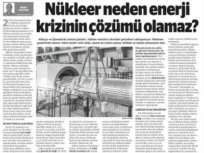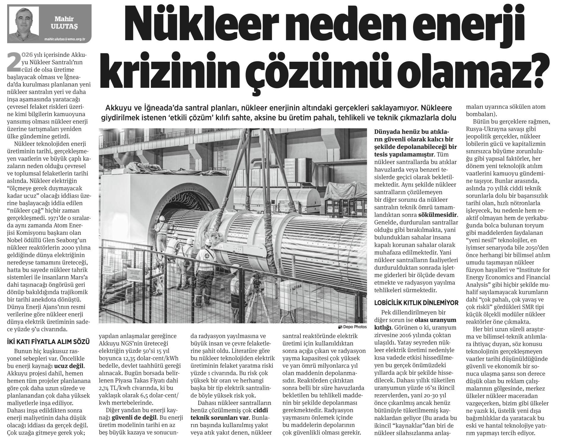Mahir ULUTAŞ Nükleer neden enerji krizinin çözümü olamaz? 2026 yılı içerisinde Akkuyu Nükleer Santralı‘nm cüzi de olsa üretime başlayacak olması ve İğneada‘da kurulması planlanan yeni nükleer santralın yeri ve daha inşa aşamasında yaratacağı çevresel felaket riskleri üzerine kimi bilgilerin kamuoyuna yansımış olması nükleer enerji üzerine tartışmaları yeniden ülke gündemine getirdi. Nükleer teknolojiden enerji üretiminin tarihi, gerçekleşmeyen vaatlerin ve büyük çaplı kazaların neden olduğu çevresel ve toplumsal felaketlerin tarihi aslında. Nükleer elektriğin "ölçmeye gerek duymayacak kadar ucuz" olacağı iddiası üzerine başlayacağı iddia edilen "nükleer çağ" hiçbir zaman gerçekleşmedi. 1971‘de o sıralarda aynı zamanda Atom Enerjisi Komisyonu başkanı olan Nobel ödüllü Glen Seaborg‘un nükleer reaktörlerin 2000 yılma geldiğinde dünya elektriğinin neredeyse tamamını üreteceği, hatta bu sayede nükleer tahrik sistemleri ile insanların Mars‘a dahi taşınacağı öngörüsü geri dönüp bakıldığında trajikomik bir tarihi anekdota dönüştü. Dünya Enerji Ajans‘ının resmi verilerine göre nükleer enerji dünya elektrik üretiminin sadece yüzde 9‘u civarında. İKİ KATI FİYATLA ALIM SÖZÜ Bunun hiç kuşkusuz rasyonel sebepleri var. Öncelikle bu enerji kaynağı ucuz değil. Akkuyu projesi dahil, hemen hemen tüm projeler planlanana göre çok daha uzun sürede ve planlanandan çok daha yüksek maliyetlerle inşa ediliyor. Dahası inşa edildikten sonra enerji maliyetinin daha düşük olacağı iddiası da gerçek değil. Çok uzağa gitmeye gerek yok; Akkuyu ve İğneada‘da santral planları, nükleer enerjinin altındaki gerçekleri saklayamıyor. Nükleere giydirilmek istenen ‘etkili çözüm‘ kılıfı sahte, aksine bu üretim pahalı, tehlikeli ve teknik çıkmazlarla dolu Dünyada henüz bu atıkların güvenli olarak kalıcı bir şekilde depolanabileceği bir tesis yapılamamıştır. Tüm nükleer santrallarda bu atıklar havuzlarda veya benzeri tesislerde geçici olarak bekletilmektedir. Aynı şekilde nükleer santralların çözülemeyen bir diğer sorunu da nükleer santralın teknik ömrü tamamlandıktan sonra sökülmesidir. Genelde, durdurulan santrallar olduğu gibi bırakılmakta, yani bulundukları sahalar insana kapalı korunan sahalar olarak muhafaza edilmektedir. Yani nükleer santralların faaliyetleri durdurulduktan sonrada işletme giderleri bir ölçüde devam etmekte ve radyasyon yayılma tehlikeleri sürmektedir. LOBİCİLİK KITLIK DİNLEMİYOR Pek dillendirilmeyen bir diğer sorun ise olası uranyum kıtlığı. Görünen o ki, uranyum zirvesine 2016 yılında çoktan ulaşıldı. Yatay seyreden nükleer elektrik üretimi nedeniyle kısa vadede etkisi hissedilmeyen bu gerçek önümüzdeki yıllarda açık bir şekilde hissedilecek. Dahası yıllık tüketilen uranyumun yüzde 16‘sı ikincil rezervlerden, yani 20-30 yıl önce çıkarılmış ancak henüz bütünüyle tüketilmemiş kaynaklardan geliyor (Bu arada bu ikincil "kaynaklar"dan biri de nükleer silahsızlanma anlaşyapılan anlaşmalar gereğince Akkuyu NGS‘nin üreteceği elektriğin yüzde 50‘si 15 yıl boyunca 12,35 dolar-cent/kWh bedelle, devlet taahhütü gereği alınacak. Bugün borsada belirlenen Piyasa Takas Fiyatı dahi 2,74 TL/kwh civarında, ki bu yaklaşık olarak 6,5 dolar-cent/ kwh mertebelerinde. Diğer yandan bu enerji kaynağı güvenli de değil. Bu enerji üretim modelinin tarihi en az beş büyük kazaya ve sonucunda radyasyon yayılmasına ve büyük insan ve çevre felaketlerine şahit oldu. Literatüre göre bu nükleer teknolojiden elektrik üretiminin felaket yaratma riski yüzde 1 civarında. Bu risk çok yüksek bir oran ve herhangi başka bir tip elektrik santralinde böyle yüksek risk yok. Dahası nükleer santralların henüz çözülmemiş çok ciddi teknik sorunları var. Bunların başında kullanılmış yakıt veya atık yakıt denen, nükleer santral reaktöründe elektrik üretimi için kullanıldıktan sonra açığa çıkan ve radyasyon yayma kapasitesi çok yüksek ve yarı ömrü milyonlarca yıl olan maddenin depolanmasıdır. Reaktörden çıktıktan sonra belli bir süre havuzlarda bekletilen bu tehlikeli maddenin bir şekilde depolanması gerekmektedir. Radyasyon yaymasını önlemek içinde bu maddelerin depolarının çok güvenlikli olması gerekir. maları uyarınca sökülen atom bombaları). Bütün bu gerçeklere rağmen, Rusya-Ukrayna savaşı gibi jeopolitik gerçekler, nükleer lobilerin gücü ve kapitalizmin sınırsızca büyüme zorunluluğu gibi yapısal faktörler, her dönem yeni teknolojik atılım vaatlerini kamuoyu gündemine taşıyor. Bunlar arasında, aslında 70 yıllık ciddi teknik sorunlarla dolu bir başarısızlık tarihi olan, hızlı nötronlarla işleyecek, bu nedenle hem reaktif olmayan hem de yerkabuğunda bolca bulunan toryum gibi maddelerden faydalanan "yeni nesil" teknolojiler, en iyimser senaryoda bile 2050‘den önce herhangi bir bilimsel atılım umudu taşımayan nükleer füzyon hayalleri ve "Institute for Energy Economics and Financial Analysis" gibi hiçbir şekilde muhalif sayılamayacak kurumların dahi "çok pahalı, çok yavaş ve çok riskli" gördükleri SMR tipi küçük ölçekli modüler nükleer reaktörler öne çıkmakta. Her biri uzun süreli araştırma ve bilimsel-teknik atılımlara ihtiyaç duyan, söz konusu teknolojinin gerçekleşmeyen vaatler tarihi düşünüldüğünde güvenli ve ekonomik bir sonuca ulaşma şansı son derece düşük olan bu reklam çalışmalarının gölgesinde, merkez ülkeler nükleer maceradan vazgeçerken, bizim gibi ülkeler ne yazık ki, üstelik yeni dışa bağımlılıklar da yaratacak bu eski ve hantal teknolojiye yatırım yapmayı tercih ediyor.