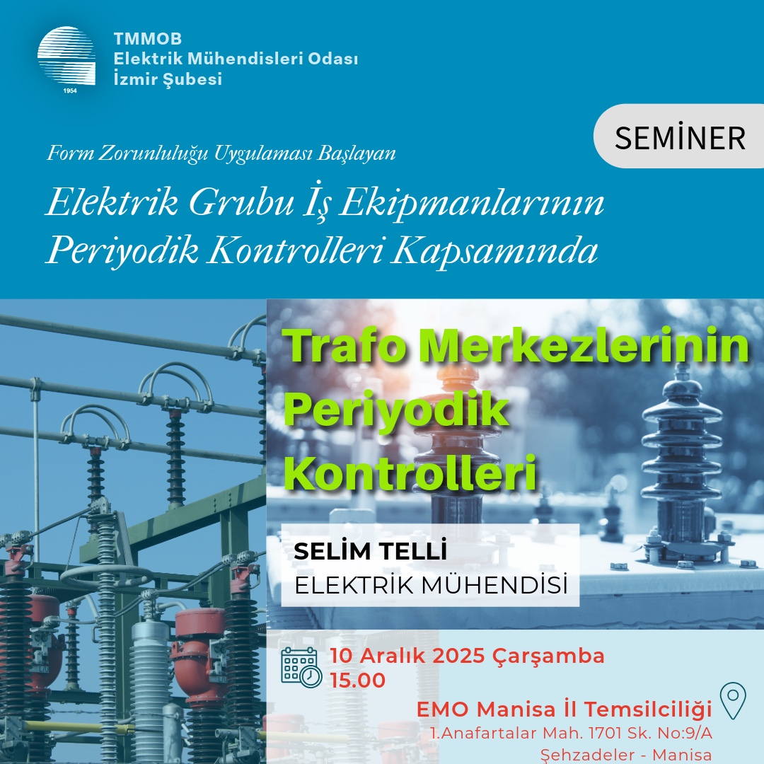 Elektrik Mühendisleri Odası (EMO) İzmir Şubesi, form zorunluluğu uygulaması başlayan elektrik grubu iş ekipmanlarının periyodik kontrollerine ilişkin EMO Manisa İl Temsilciliği`ne bir seminer dizisi düzenleyecektir. Seminer takvimine yazımızın devamından ulaşabilirsiniz.