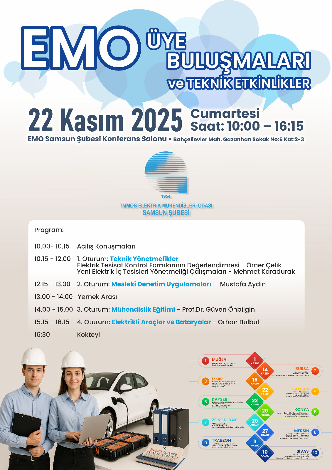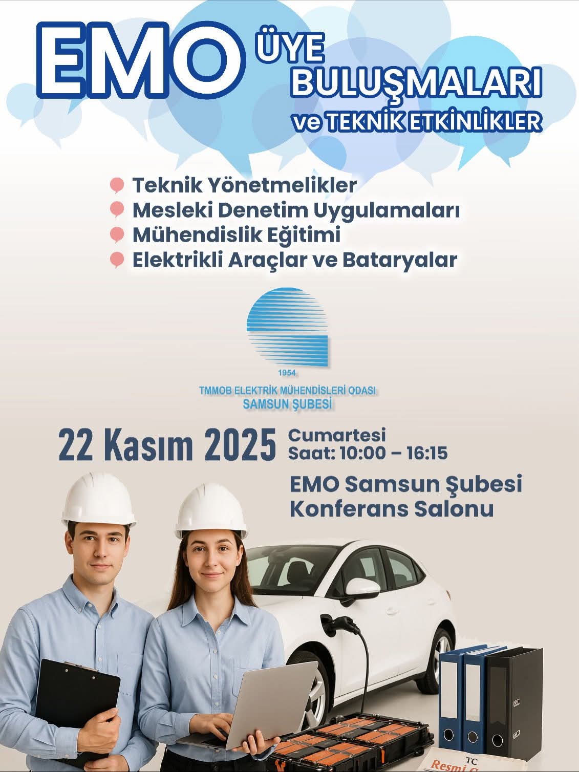 Elektrik Mühendisleri Odası Samsun şube konferans salonunda 22 Kasım 2025 tarihinde gerçekleştireceğimiz etkinliğe meslektaşlarımızı ve konuya ilgi duyan tüm vatandaşlarımızı bekliyoruz.