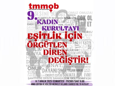 TMMOB 48. Dönem Kadın Çalışma Grubu tarafından, `Eşitlik için Örgütlen Diren Değiştir` ana başlığıyla planlanan TMMOB 9. Kadın Kurultayı 6-7 Aralık 2025 tarihinde MMO Eğitim ve Kültür Merkezi`nde gerçekleştirilecek.