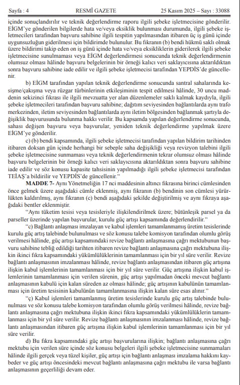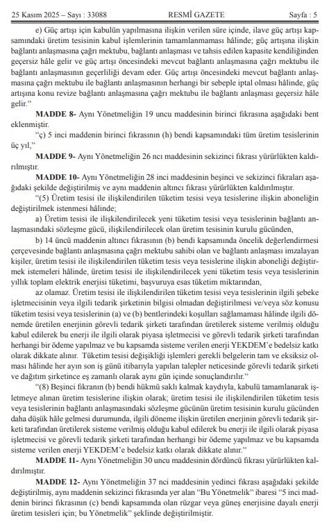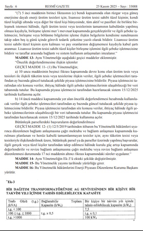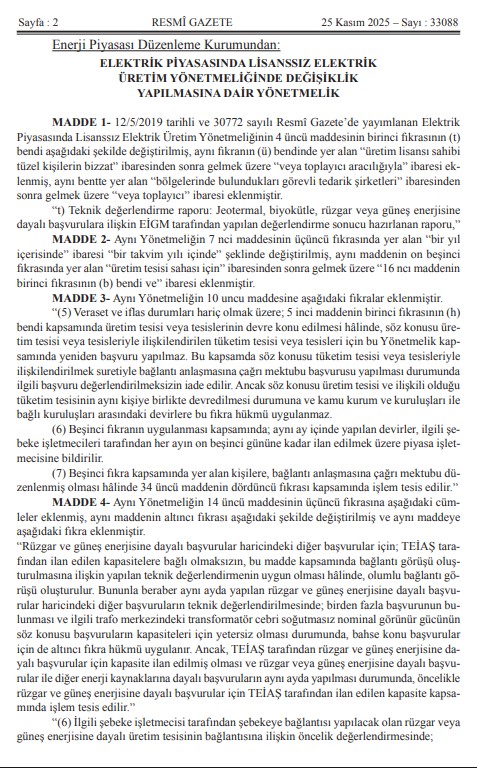 Kıymetli Üyelerimiz, Mevzuat Takip Sistemimiz bilgilendirmesine göre `Elektrik Piyasasında Lisanssız Elektrik Üretim Yönetmeliğinde Değişiklik Yapılmasına Dair Yönetmelik` 25.11.2025 Tarih ve 33088 Sayılı Resmi Gazetede yayımlanmıştır.