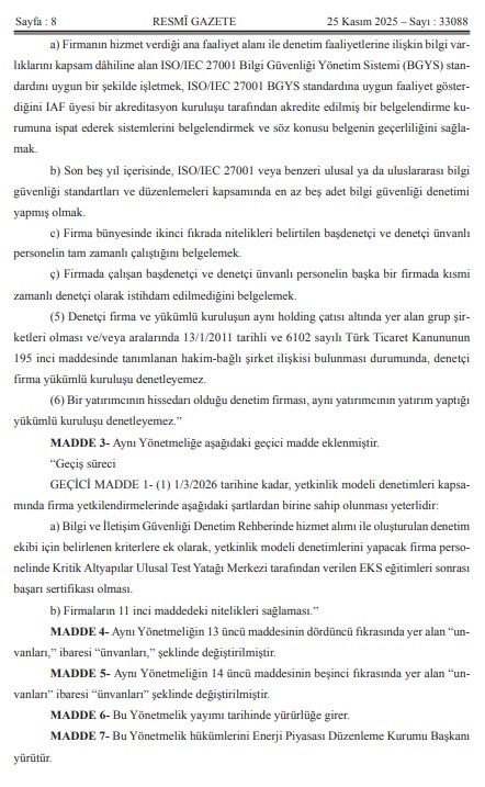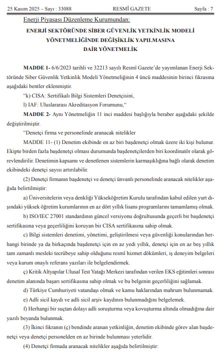 Kıymetli Üyelerimiz, Mevzuat Takip Sistemimiz bilgilendirmesine göre `Enerji Sektöründe Siber Güvenlik Yetkinlik Modeli Yönetmeliğinde Değişiklik Yapılmasına Dair Yönetmelik` 25.11.2025 Tarih ve 33088 Sayılı Resmi Gazetede yayımlanmıştır.