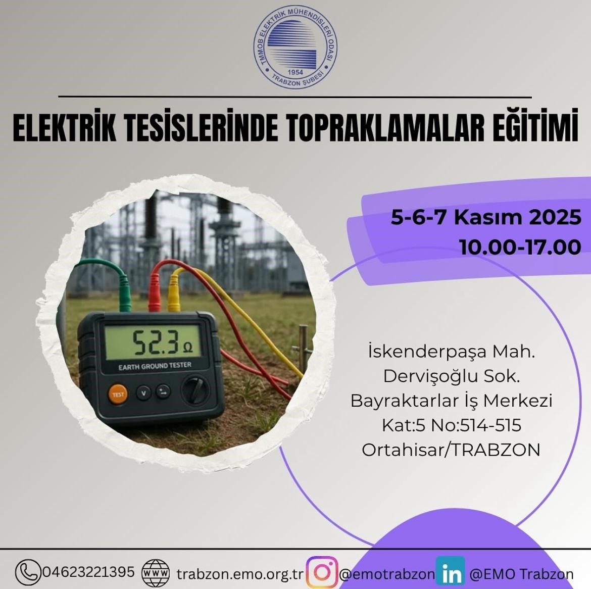 Kıymetli Üyemiz, Şubemizde 5-6-7 Kasım 2025 tarihlerinde yüz yüze Elektrik Tesislerinde Topraklamalar Eğitimi düzenlenecektir.
