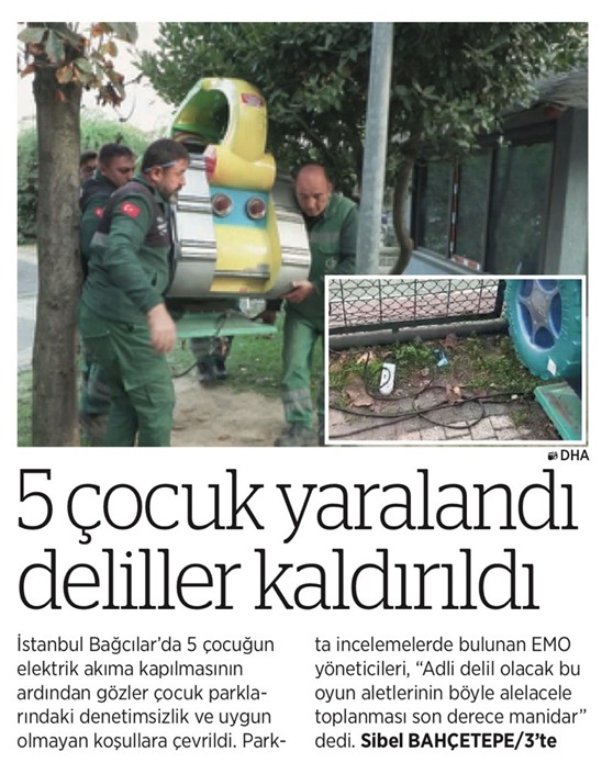 Söz konusu olay kamuoyunda her ne kadar kaza olarak adlandırılsa da net bir biçimde ihmaller ve eksik denetim sonucu gerçekleşmiş ve şans eseri facianın sınırından dönülmüştür. Söz konusu alanda özel bir işletmenin bulunması ve paralı oyuncakların bu şirkete ait olması, Bağcılar Belediyesi`nin kendi sorumluluk ve denetim alanında gerçekleşen bu olaydaki sorumluluğunu ortadan kaldırmamaktadır. Tespitler ve Bulgular 1- Parkta kurulumu yapılan çocuk oyun aletlerinin dış ortam şartlarına uygun üretilmediği, daha çok iç ortamlarda kullanıma uygun olduğu, bu nedenle yağmur gibi dış etkilerden kolay etkilenmiş ve cihaz içine su girerek elektrik kaçağına neden olduğu düşünülmektedir. 2- Kablolama, saha panoları, fiş-priz tesisatı gibi teçhizat da dış ortamda kullanıma uygun değildir. Panellerin üzerinde plastik deterjan bidonlarının çapraz kesilmesiyle oluşturulan gölgelik/koruma gözlemlenmiştir. Son derece iptidai olan bu yöntemin kısmen etkili olacağı kabul edilse de panoların su ve toz girişine karşı sahip olması gereken IP koruma sınıfı gereksinimlerini sağlama zorunluluğunu ortadan kaldırmaz. 3- Dış ortamda kullanılmasına kesinlikle izin verilmemesi gereken uzatma üçlü prizlerinin kullanıldığı görülmüştür. 4- Oyuncakların bulunduğu alana komşu olan basketbol sahasını çevreleyen tel örgüye asılı duran fiş-priz düzenleri de harici kullanıma uygun değildir. Bu düzenler de yine plastik bidonlardan bozma gölgeliklerle korunmaya çalışılmıştır. 5- Cihazların kablo girişlerinde kullanılan rakorlar yerlerinden çıkmış ve cihazlar alttaki kablo girişlerinden su almaya müsait hale gelmiştir. 6- Bütün bunlara karşın cihazları besleyen dağıtım panolarında artık akım koruma anahtarının (yaygın kullanılan deyimiyle kaçak akım koruma cihazlarının) olmadığı belediye yetkililerinin raporunda belirtilmiştir .Yine aynı raporda Oyun makinelerine giden hattın pano ucundan toprak bağlantısının kesildiği ifade edilmiştir. ÖNERİ VE UYARILAR Bu tespitlerin ışığında bu tür çocuk parklarındaki jetonlu oyun aletleri ve bu aletlerin bağlandığı tesislerde alınması gereken önlemlerle ilgili olarak: 1- Çocuk parklarındaki elektrikli oyun aletleri bulunduğu ortama uygun seçilmeli, iç ortamlara uygun olarak tasarlanmış oyun aletleri kesinlikle dış ortamda kullanılmamalıdır. Bu oyun aletlerinin CE uygunluk belgesi mutlaka sorgulanmalıdır . Üretici veya ithalatçı firmalar tarafından sunulan CE uygunluk beyanı (deklerasyonu) ile yetinilmemeli, Bağımsız ve akredite bir laboratuvar tarafından gerçekleştirilmiş , CE uygunluğuna esas olan LVD( Zayıf Akım Yönergesi) ve EMC ( Elektromanyetik Uygunluk ) test raporlarının sorgulanması önemlidir. 2- Dış ortamlarda kullanılacak oyun aletlerinin elektrik aksamları su ve toz geçirmeyen uygun IP koruma sınıfında kutular içinde korunmalıdır. 3- Bu oyun aletlerine enerji taşıyan kablolar yine dış ortam şartlarına uygun dayanıklılık özelliğine sahip olmalı, kablolarda hiçbir fiziksel hasar olmamalı ve kablolar mekanik darbelere karşı korunmalıdır. 4- Kabloların cihaz bağlantı kutularına girişleri yine uygun sızdırmazlık özelliklerine sahip sertifikalı kablo rakorları ile yapılmalıdır. 5- İç ortamlar için tasarlanmış uzatma prizleri gibi cihazlarla bağlantı dış ortamlarda kesinlikle yapılmamalıdır. 6- Cihazların koruma topraklaması mutlaka uygun toprak hattına bağlanmalıdır. 7- Bu oyun aletlerini besleyen panolardaki sigortalar uygun şekilde boyutlandırılmalı ve her bir tüketim devresine mutlaka 30mA artık akım anahtarı (halk dilinde bilinen adıyla kaçak akım rölesi) tesis edilmelidir. 8- Tesisat tesis edilmeden önce mutlaka Elektrik Mühendisliği hizmeti alınmalı ve projelendirme yapılmalı, enerjilendirildikten sonra ise yılda bir kez mevzuata uygun olarak elektrik tesisat denetimleri ve periyodik kontroller yapılmalıdır.