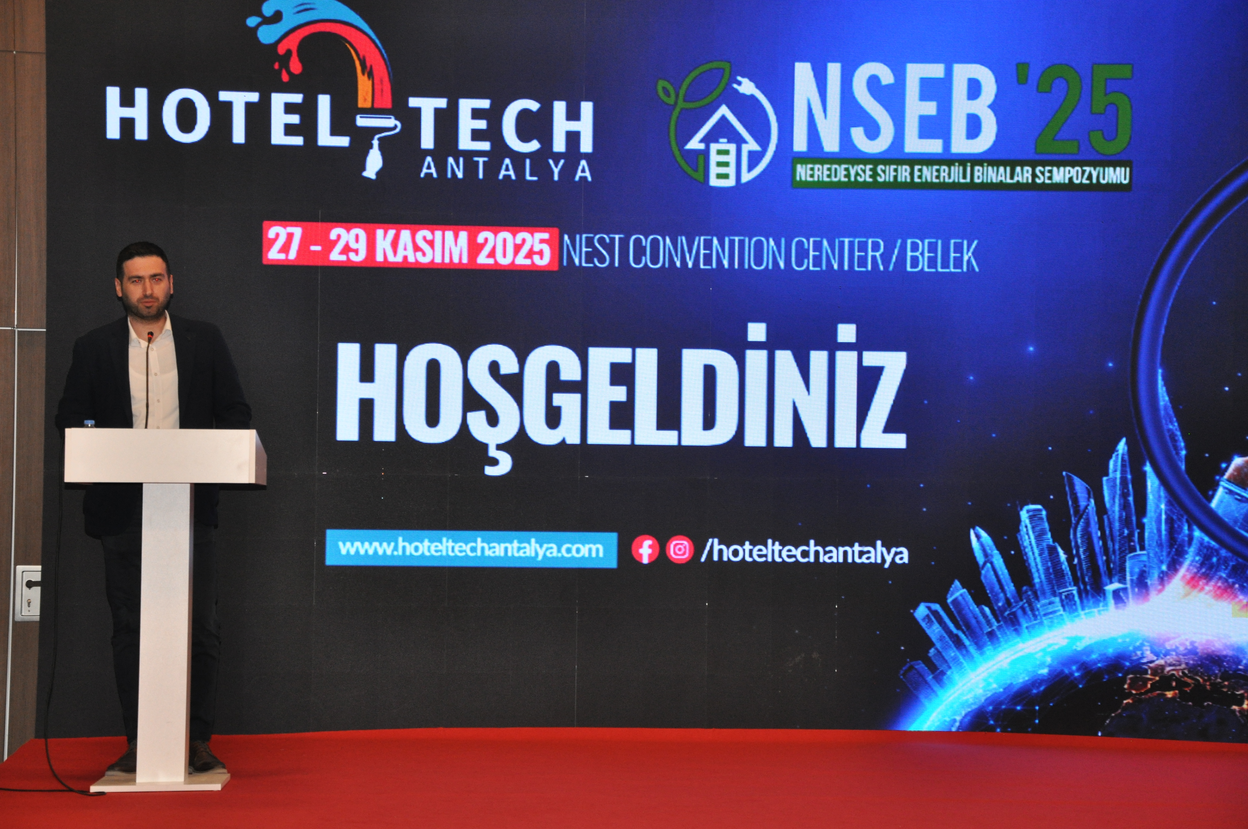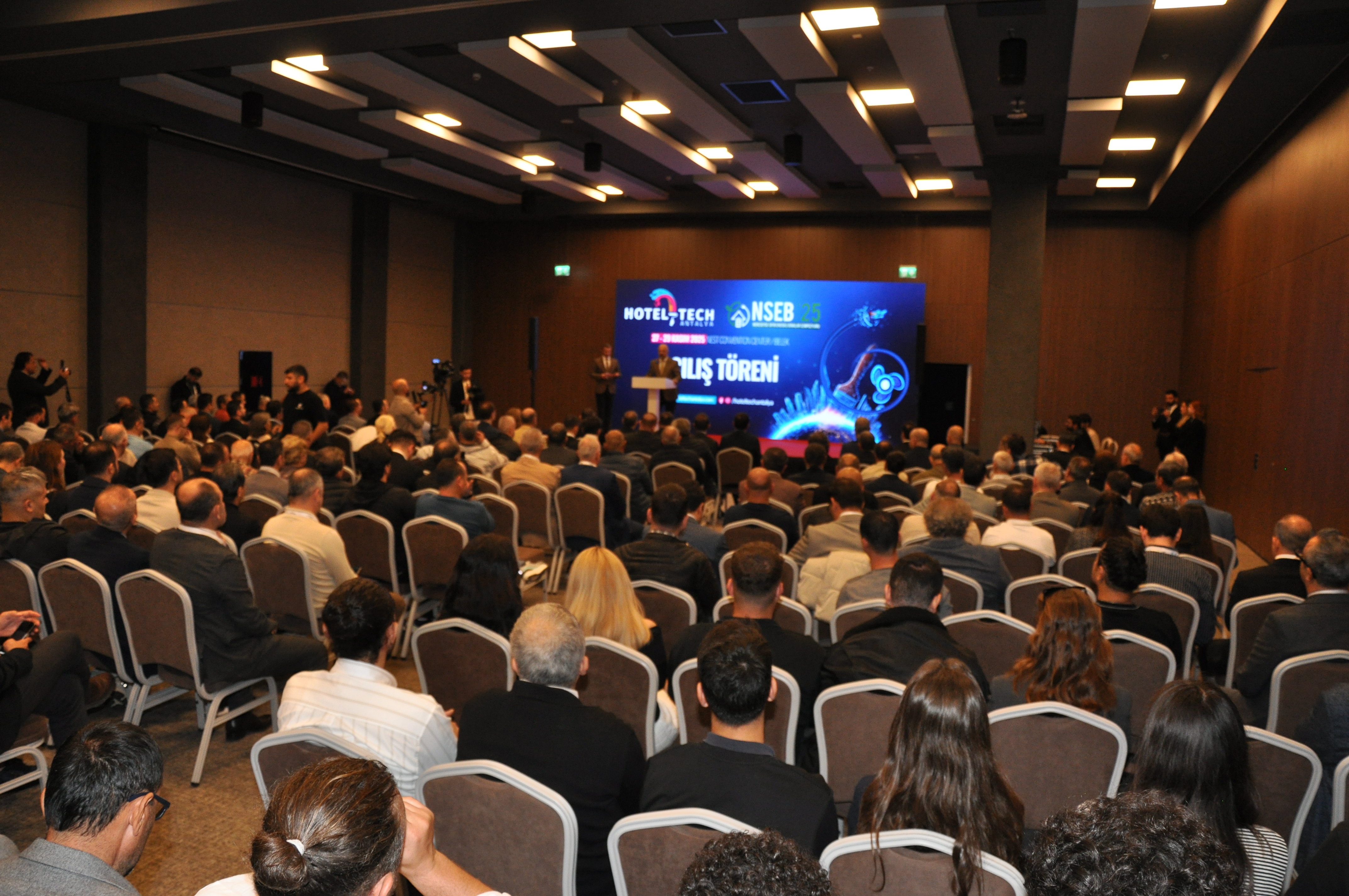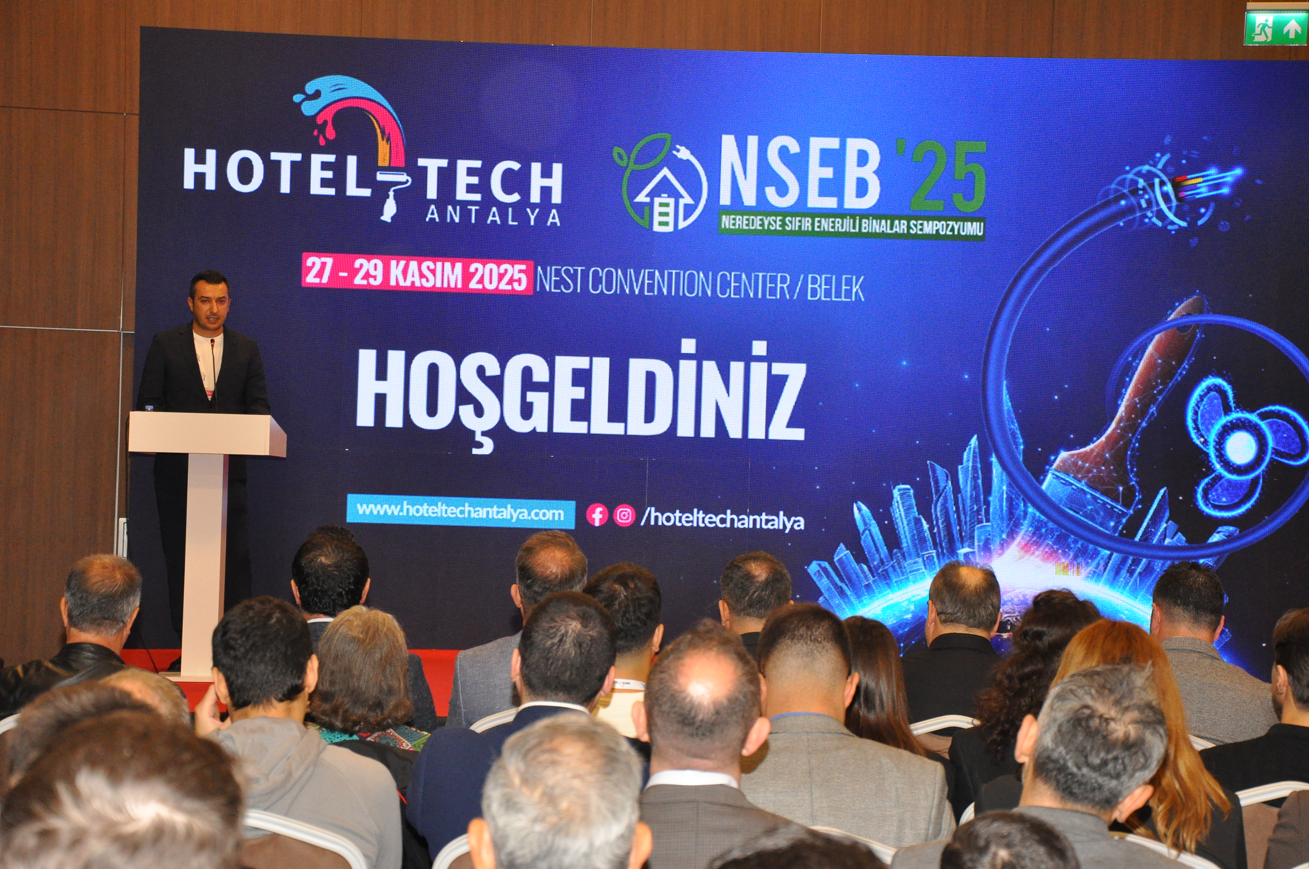 NSEB’2025–Neredeyse Sıfır Enerjili Binalar Sempozyumu ve HOTEL-TECH Antalya 3. Otel Teknik Ekipman ve Malzemeleri Fuarı, 27-28-29 Kasım 2025 tarihlerinde NEST Kongre ve Fuar Merkezi’nde gerçekleştirildi.TMMOB Elektrik Mühendisleri Odası, İnşaat Mühendisleri Odası, Makina Mühendisleri Odası ve Mimarlar Odası Antalya Şubeleri ile Plan-T Fuarcılık iş birliğinde düzenlenen Sempozyum ve fuarın açılış törenine Şube Başkanımız Şaban TAT, Antalya Ticaret ve Sanayi Odası Yön.Kur.Bşk. Yusuf HACISÜLEYMAN, çok sayıda meslek odası ve STK Başkanı katıldı.Habere ilişkin detaylı bilgiye yazımızın devamından ulaşabilirsiniz.