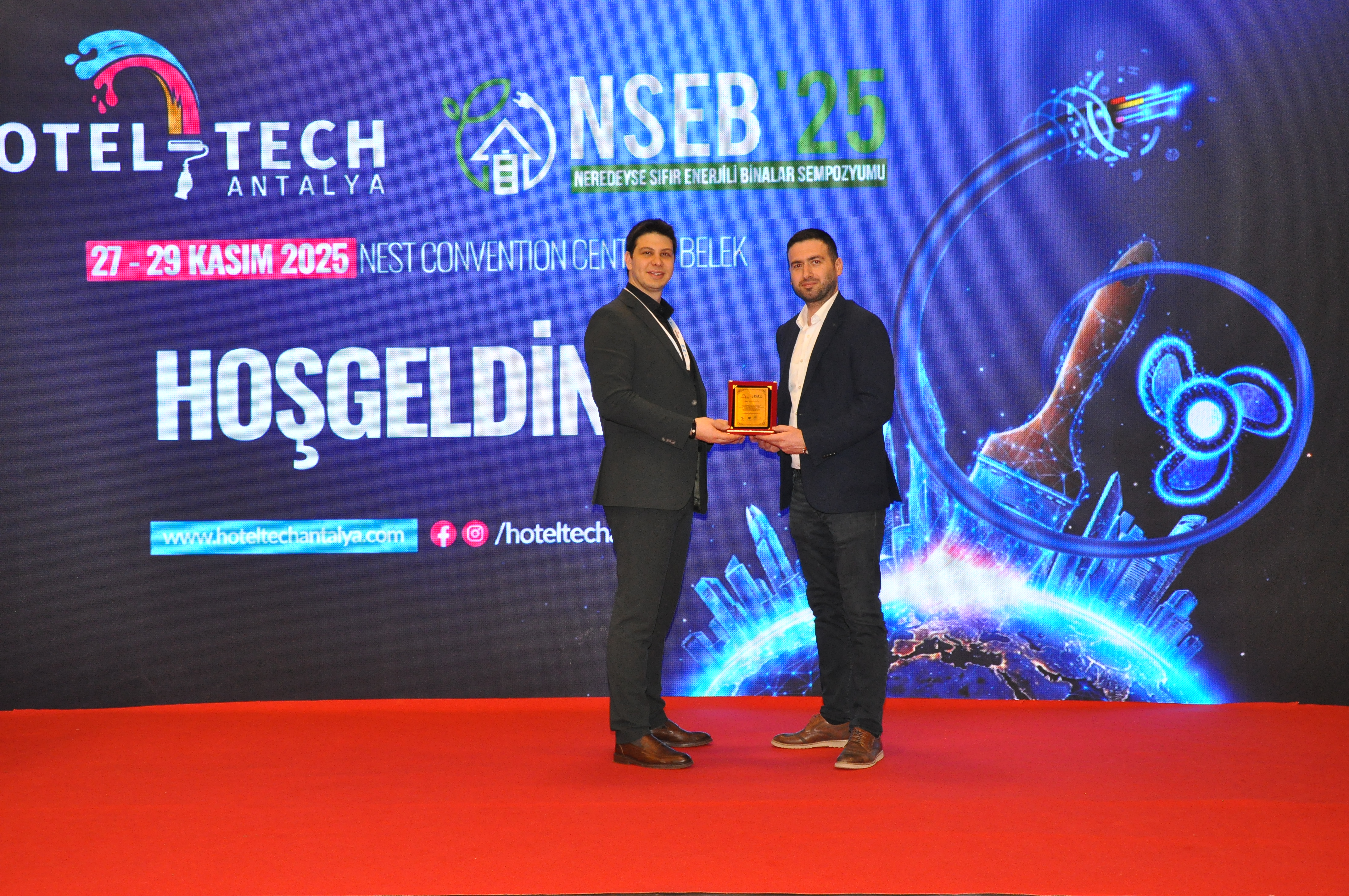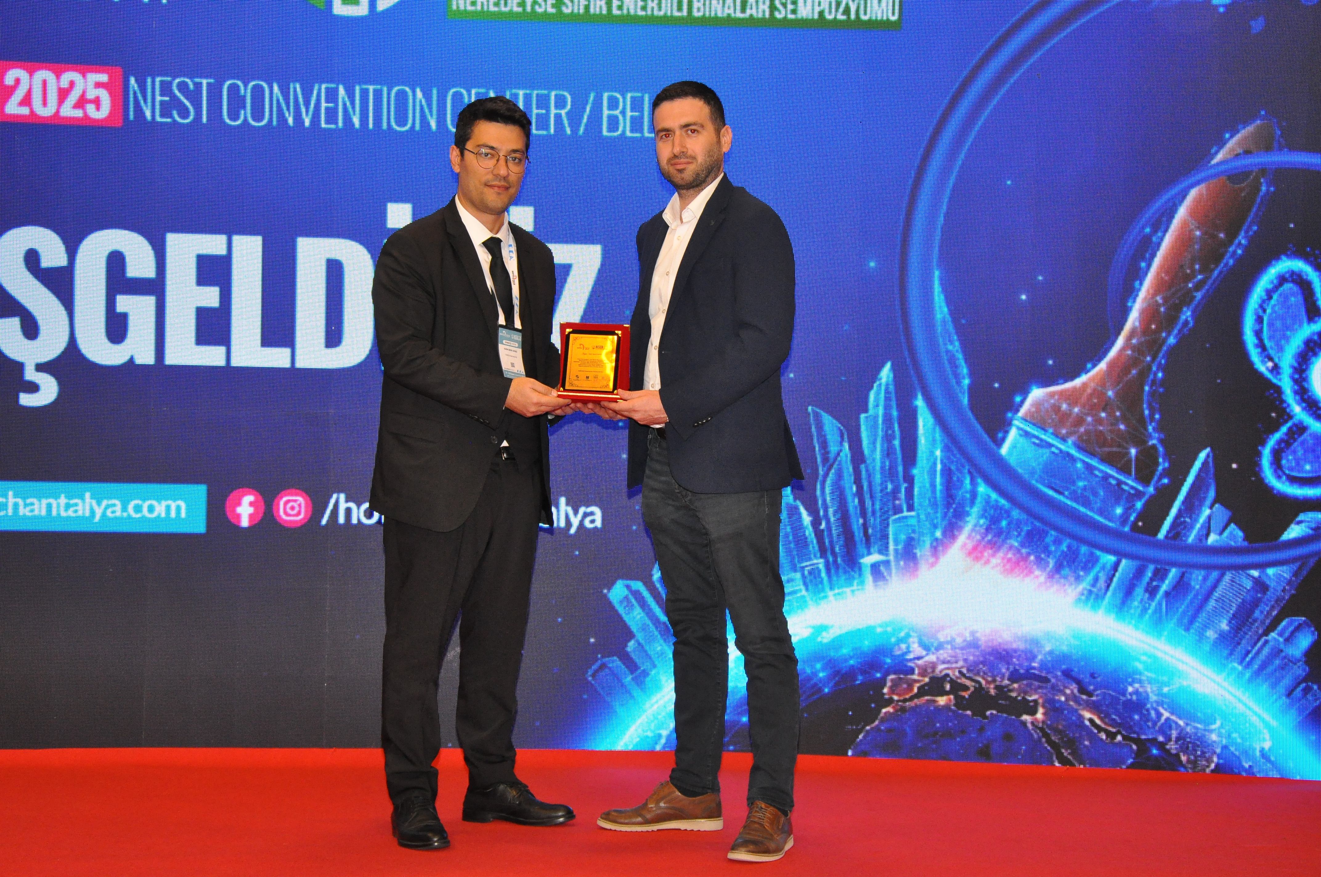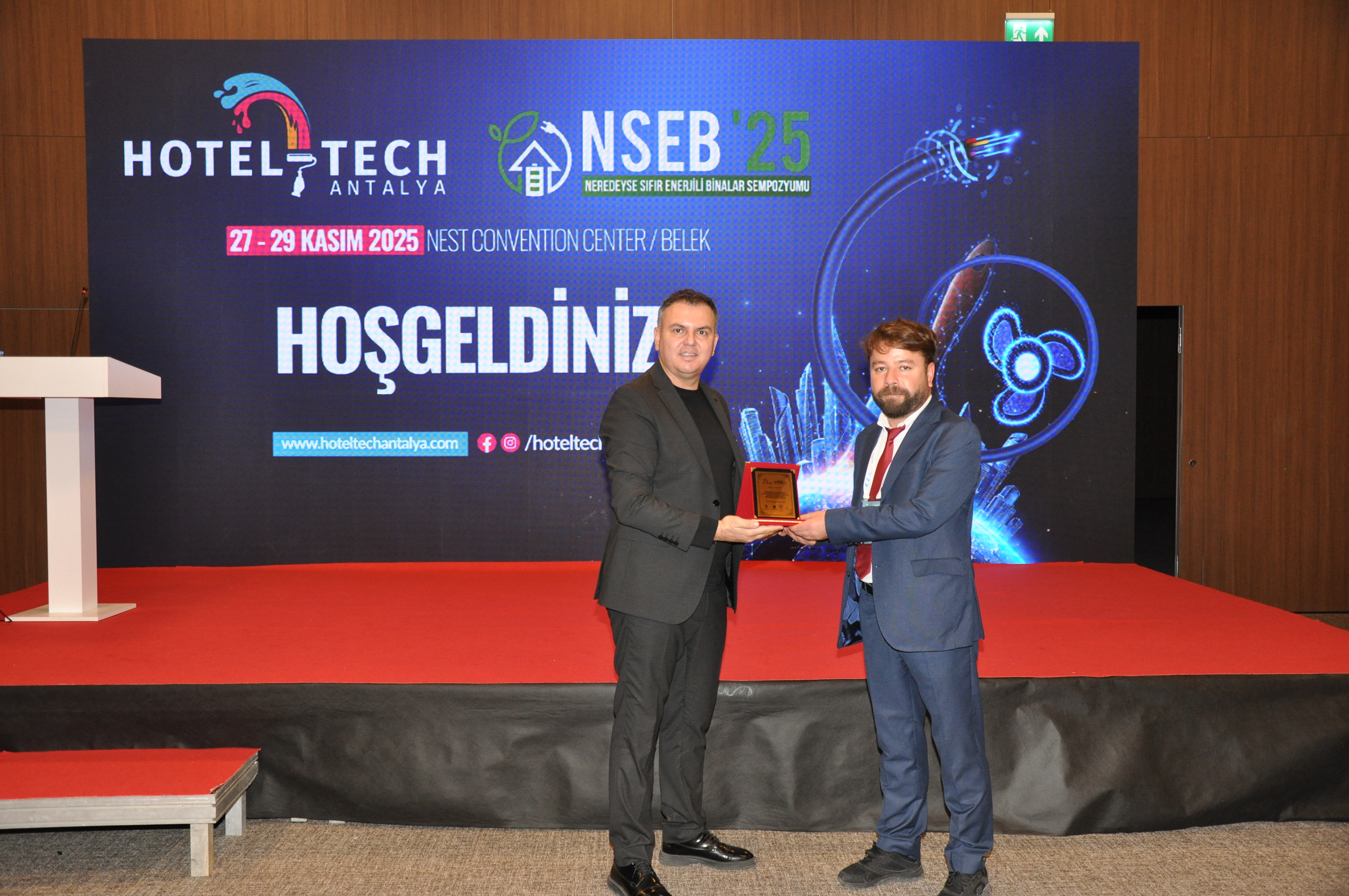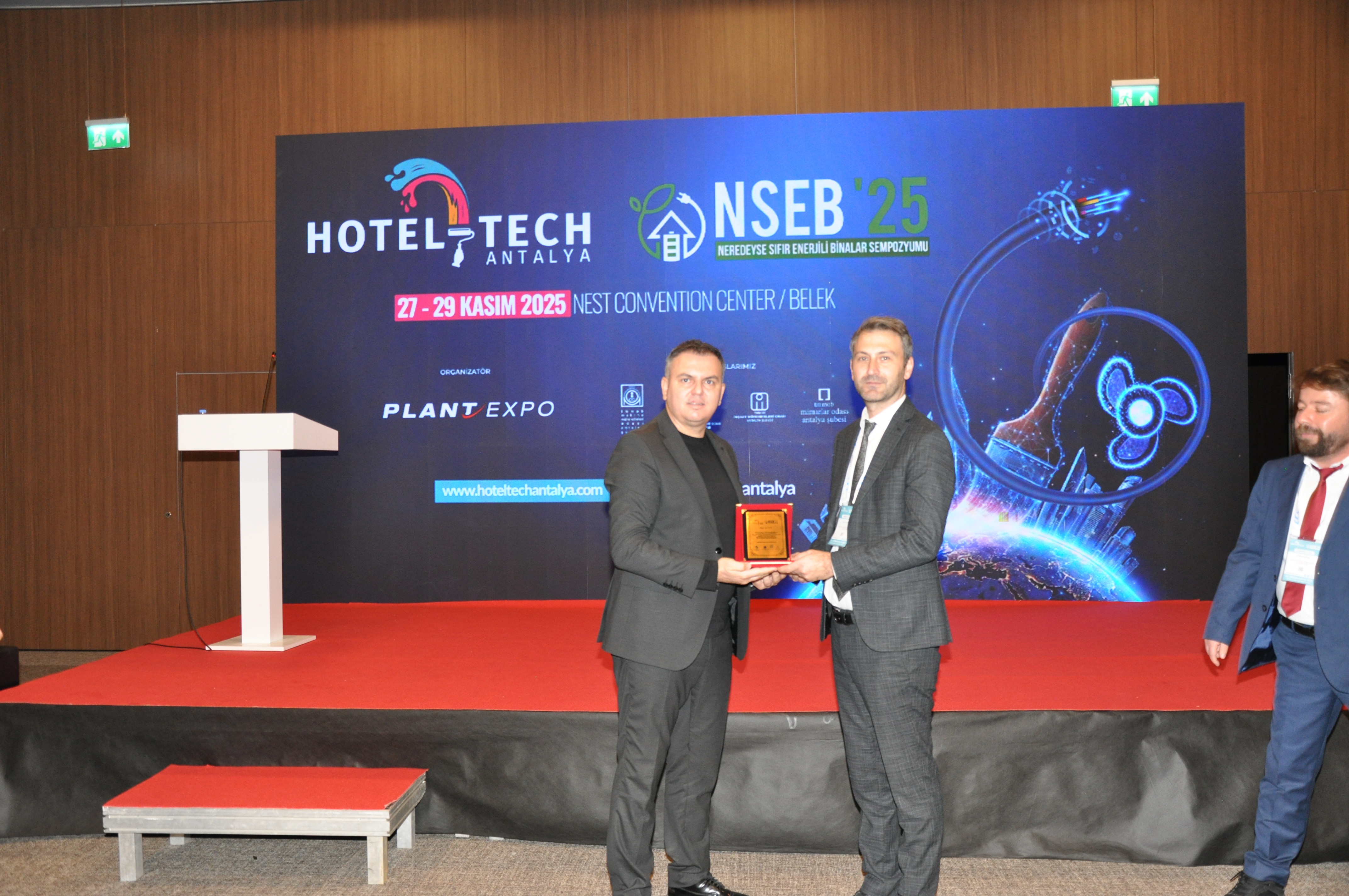 Şube Başkanımız Şaban TAT, HOTEL-TECH Antalya – 3. Otel Teknik Ekipman ve Malzemeleri Fuarı`na katılan üyelerimiz ile katılımcı firmaların stantlarını ziyaret ederek başarılı bir fuar geçirmeleri yönündeki temennilerini iletti. Ayrıca EMOAntalya Şubesi olarak sempozyum ve fuar boyunca tanıtım standımızla da yer aldık. "Sıfır Enerji, Sonsuz Gelecek" temasıyla düzenlenen sempozyumda dört ana oturumda toplam 14 sunum yapıldı, farklı disiplinlerden uzmanların bilgi ve deneyimleri paylaşıldı. NSEB`25 – Neredeyse Sıfır Enerjili Binalar Sempozyumu`nun ilk gününde Yangın Güvenliği Oturumu gerçekleştirildi. Oturumda; Şubemiz adına Üyemiz Alper GÜL "Yangın Algılama ve Otomasyon Sistemleri", Makina Mühendisleri Odası Antalya Şubesi adına Dr. Cüneyt Deniz KÜHEYLAN "Yangın Güvenliğinde Mekanik Sistemler", Mimarlar Odası Antalya Şubesi adına Doç. Dr. Nuri SERTESER "Yangın Kaçış Tasarımları" ve İnşaat Mühendisleri Odası Antalya Şubesi adına Yalçın ARSLAN "Binalarda Pasif Yangın Durdurucu Önlemler" başlıklı sunumlarını gerçekleştirdi. NSEB`25 – Neredeyse Sıfır Enerjili Binalar Sempozyumu`nun ikinci gününde EMO Antalya Şubesi Oturumu gerçekleştirildi. Şube Yazmanımız Emre EKE` nin oturum başkanlığını yaptığı Oturumda; • Necip AYAS- T.C. Çevre, Şehircilik ve İklim Değişikliği Bakanlığı – "Binalarda Enerji Verimliliği Mevzuatı ve Faaliyetleri" •Enes DOĞAN- T.C. Çevre, Şehircilik ve İklim Değişikliği Bakanlığı- "Binalarda Enerji Performansı Yönetmeliği Uygulamalarında Karşılaşılan Sorunlar" başlıklı sunumlarını gerçekleştirdi. Oturumun ardından konuşmacılara Şube Başkanımız Şaban TAT tarafından teşekkür plaketi takdim edildi. Diğer oturumun başkanlığını Başkan Yardımcımız Durali ÇAKIR yaparken, bu oturumda da; •Umut AYDOĞMUŞ- Signify Türkiye "Binalarda Enerji Performansı Yönetmeliği Uygulamalarında Karşılaşılan Sorunlar" •Yasin Berk DENİZ- T.C. Enerji ve Tabii Kaynaklar Bakanlığı- "Enerji Verimliliği Hibe Destekleri" başlıklı sunumlarını gerçekleştirdi. Oturumun ardından konuşmacılara Şube Başkan Yardımcımız Durali ÇAKIR tarafından teşekkür plaketi takdim edildi.