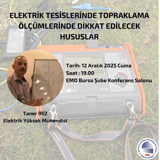 12 Aralık 2025 Cuma günü saat 19.00`da EMO Bursa Şubesi Konferans Salonunda Elektrik Yüksek Mühendisi Taner İRİZ’ in konuşmacı olacağı ELEKTRİK TESİSLERİNDE TOPRAKLAMA ÖLÇÜMLERİNDE DİKKAT EDİLECEK HUSUSLAR konulu seminer düzenlenecektir. Katılım için bilgilerinize sunarız.
