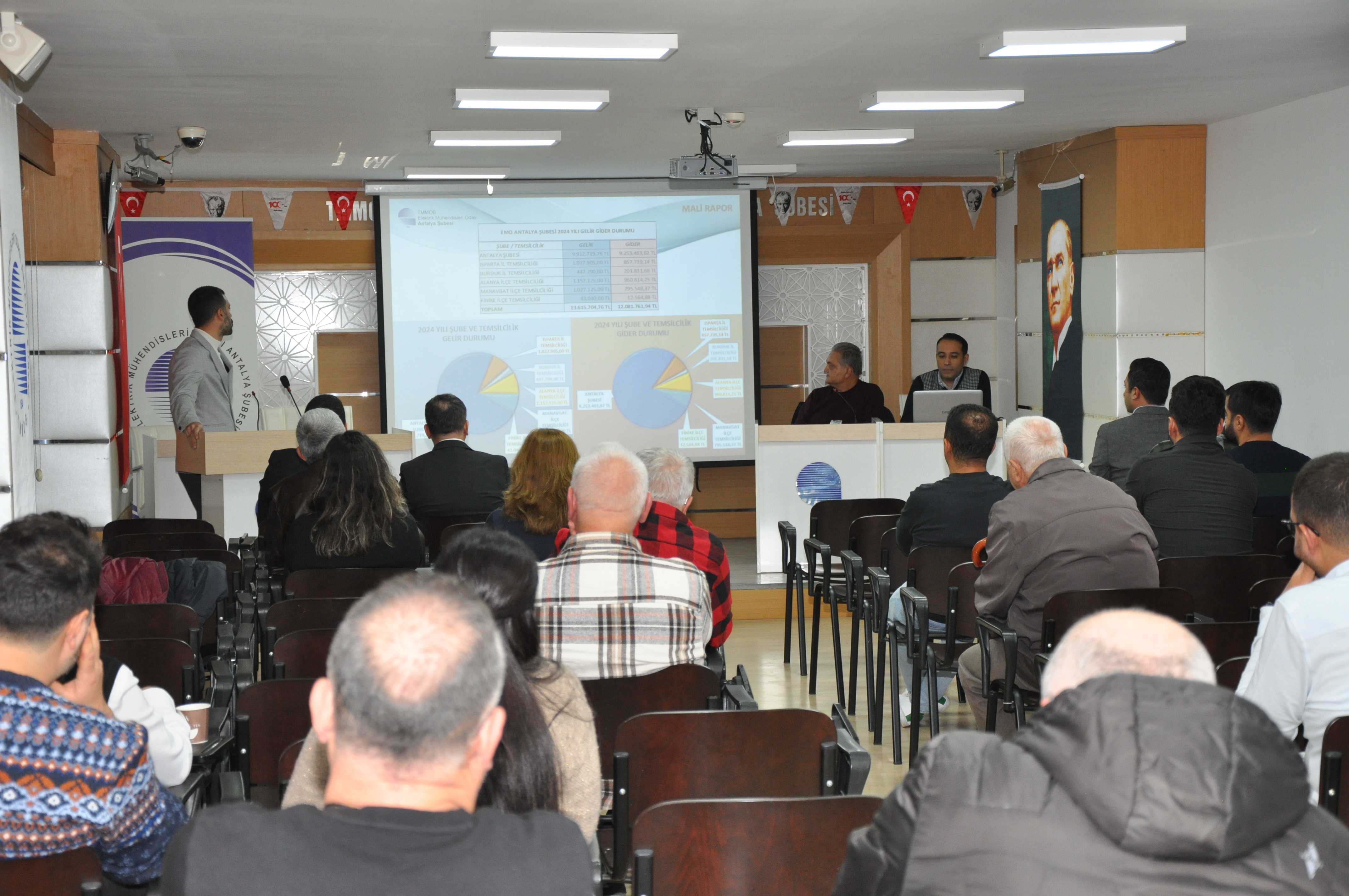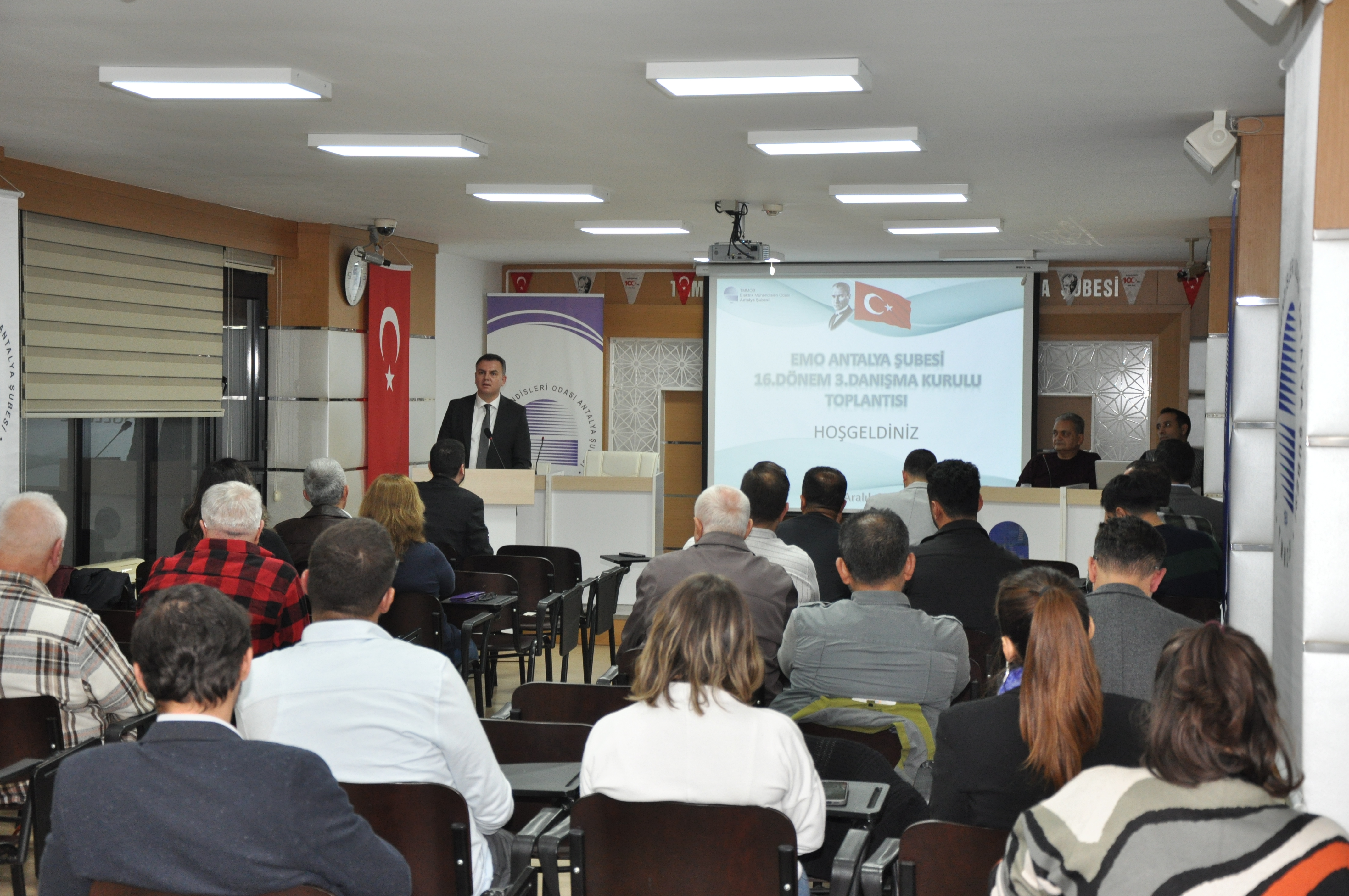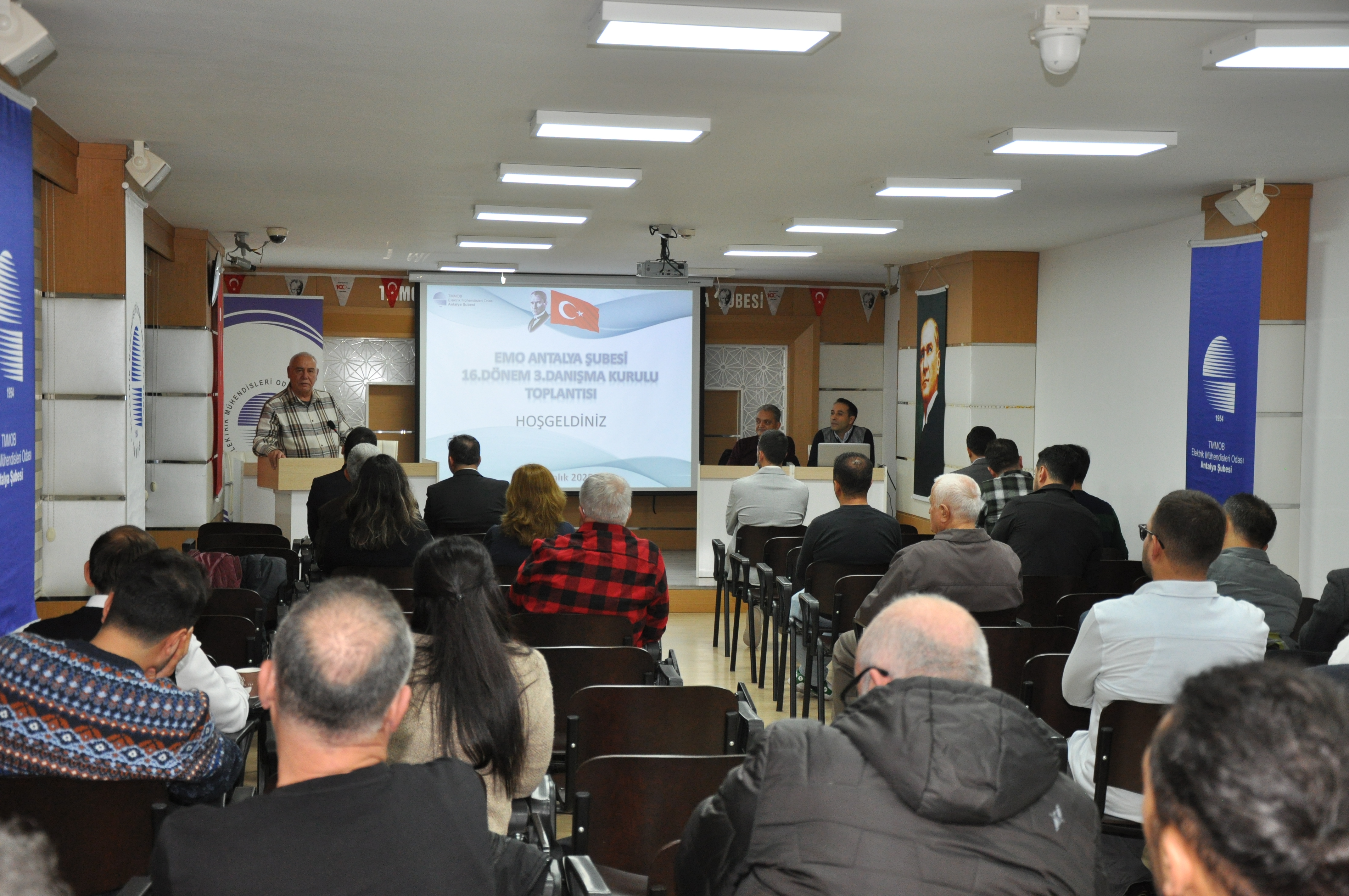 Toplantı, Şube Başkan Yardımcımız Durali ÇAKIR`ın açılışıyla başladı. Divan; Oturum Başkanı Şubemiz üyesi ve aynı zamanda 49. Dönem EMO Yönetim Kurulu Üyesi İbrahim KORU ve Sube Teknik Mudürümüz Niyazi İL`den oluşurken, toplantı saygı duruşu ve İstiklal Marşı`nın okunmasıyla devam etti. Oturum Başkanı İbrahim KORU, Danışma Kurulu toplantısında gündem maddelerini kurul üyelerine aktararak toplantının akışını başlattı. Gündeme ek madde olup olmadığı yönündeki yoklamanın ardından, hazırlanan mevcut gündem maddeleri oy birliğiyle kabul edildi. Toplantının ilk bölümünde Şube Yazmanımız Emre EKE, "Şube Çalışmaları" gündem maddesi kapsamında 2. Danışma Kurulu Toplantısından bu yana yürütülen faaliyetleri aktardı. Sunumda; komisyon toplantıları, düzenlenen eğitim ve seminerler, mesleki denetim uygulamaları ve sosyal etkinlikler hakkında detaylı bilgiler paylaşıldı. Ardından Şube Saymanımız Seyit Çağrı YILDIRIM konuşmasında, Şube Başkanımız Şaban TAT`ın talimatları doğrultusunda Şube gelirlerinin en verimli şekilde değerlendirildiğini ifade etti. Şube`nin mali durumu üzerine bilgilendirme yaptı. Toplantının son bölümünde söz alan Şube Yönetim Kurulu Başkanımız Şaban TAT, 16. Dönem Şube çalışmalarına ilişkin değerlendirmelerde bulundu ve sekretaryası EMO Antalya Şubesi`nde yürütülen İKK (İl Koordinasyon Kurulu) faaliyetleri hakkında bilgi verdi. Dilek ve temenniler bölümünde; Oturum Başkanı İbrahim KORU ile Danışma Kurulu üyesi Rüştü BEKDİKHAN görüş ve önerilerini paylaşarak, Şube Yönetim Kurulu‘na çalışmalarından dolayı teşekkür ettiler. Toplantının kapanışında yeniden söz alan Şube Başkanımız Şaban TAT konuşmasında, Danışma ve Denetleme Kurulu Üyelerine, Şube ve Temsilcilik Yürütme Kurulu Üyelerine, Komisyonlarımızda yer alan komisyon başkanlarına ve komisyon üyelerine, Şube ve Temsilcilik çalışanlarına, Oda çalışmalarına katkı koyan, emek harcayan tüm üyelere teşekkür etti.