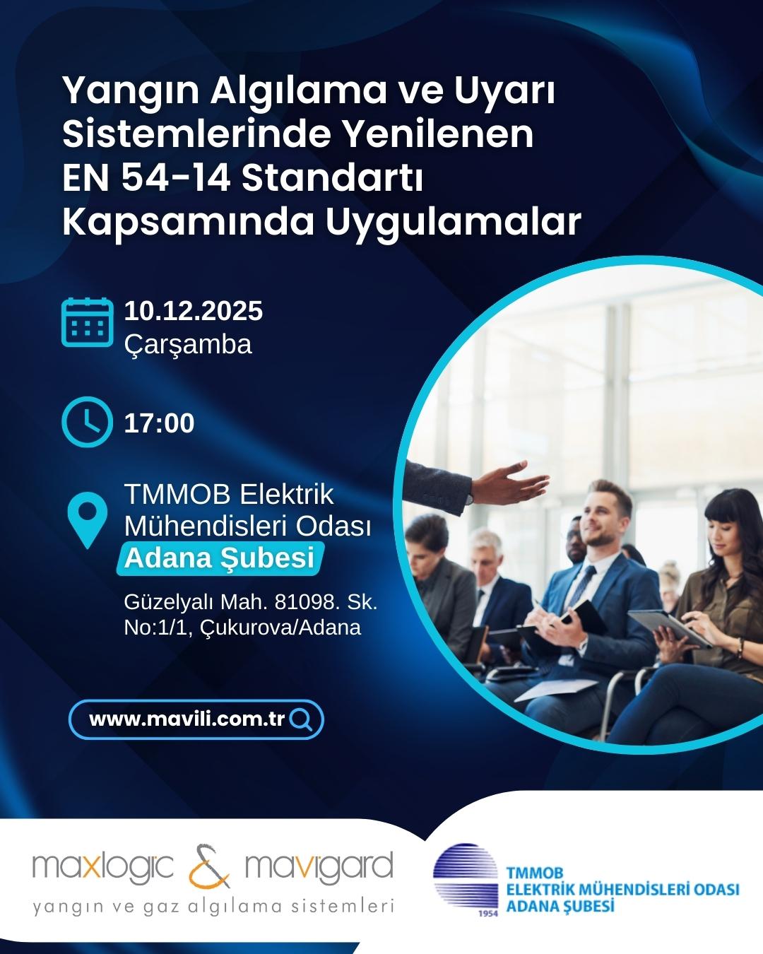 10 Aralık 2025 Çarşamba günü saat 17:00 da Şubemizde Mavili Elektronik A.Ş. firması ile `Yangın Algılama ve Uyarı Sistemlerinde Yenilenen EN 54-14 Standardı Kapsamında Uygulamalar` konulu seminer düzenlenecektir. Seminere katılım ücretsiz olup, tüm üyelerimiz davetlidir. Etkinlik afişine yazımız ekinden ulaşabilirsiniz.