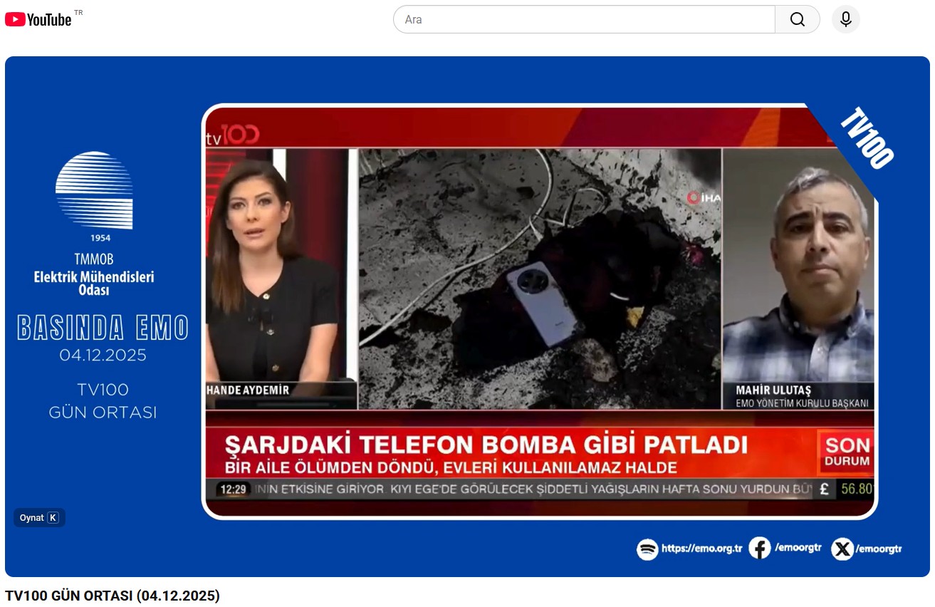EMO Yönetim Kurulu Başkanı Mahir Ulutaş Oya Çebi ile hafta içi her gün 12.00`de TV100`de yayınlanan Gün Ortası programına konuk oldu ve son günlerde cep telefonu şarjında yaşanan elektriksel tehlikeleri ve yangın risklerini değerlendirdi.