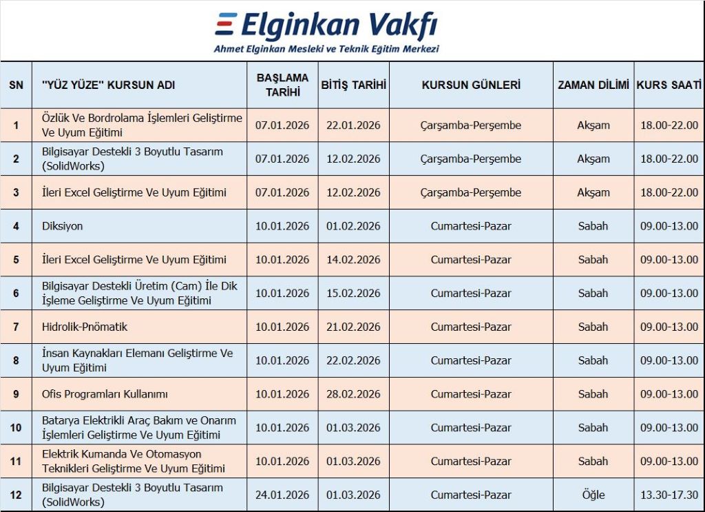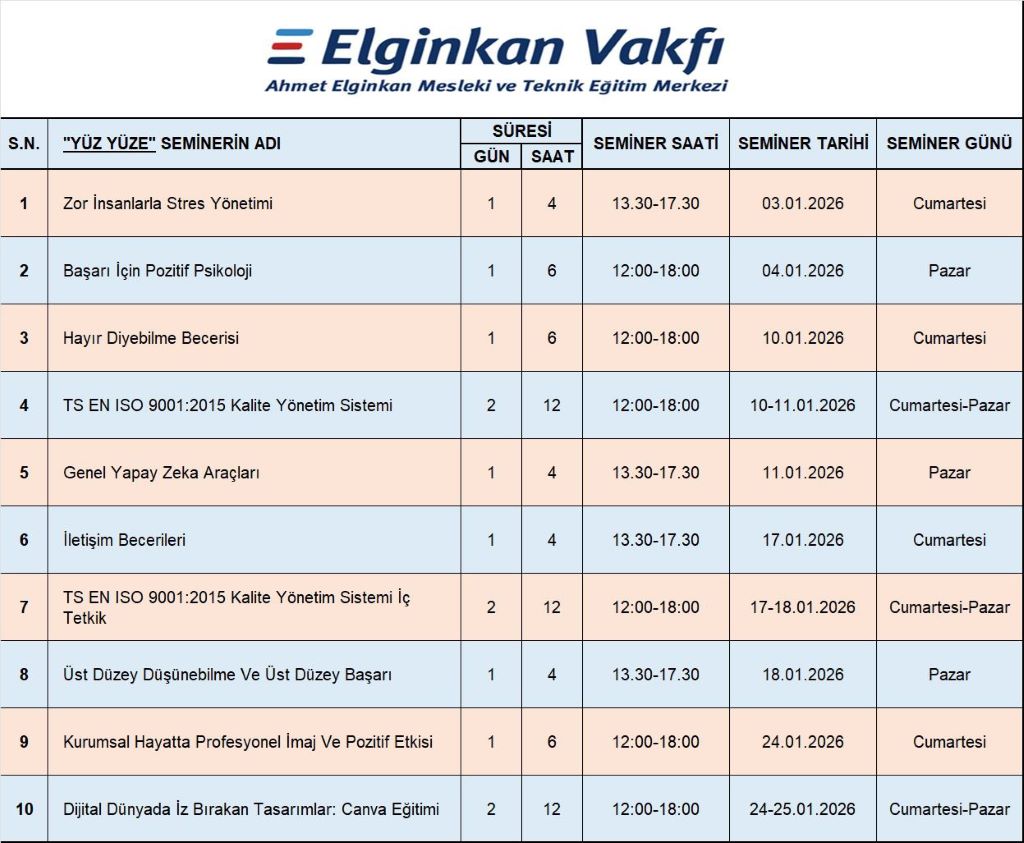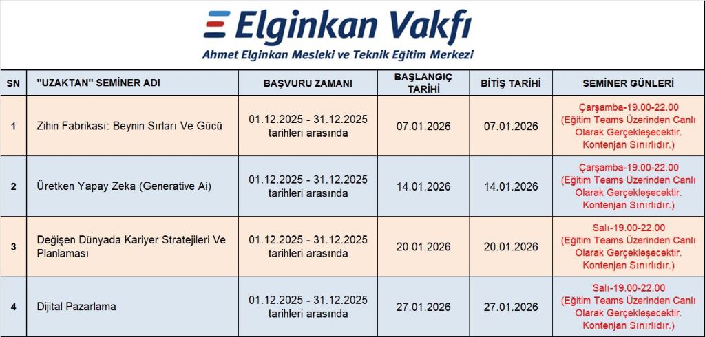 Elginkan Vakfı, Ahmet Elginkan Mesleki ve Teknik Eğitim Merkezi tarafından düzenlenecek 2026 yılı içerisinde yüz yüze kurs-seminer ile uzaktan seminer takvimi yayınlanmış olup kayıt ve başvuru yapmak için aşağıdaki linkten ulaşabilirsiniz.