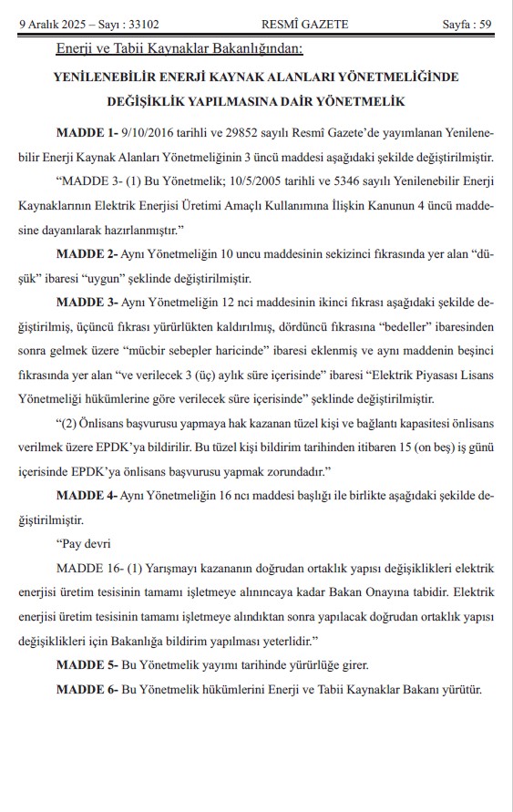 Kıymetli Üyelerimiz, Mevzuat Takip Sistemimiz bilgilendirmesine göre `Yenilenebilir Enerji Kaynak Alanları Yönetmeliğinde Değişiklik Yapılmasına İlişkin Yönetmelik` 09.12.2025 Tarih ve 33102 Sayılı Resmi Gazetede yayımlanmıştır.