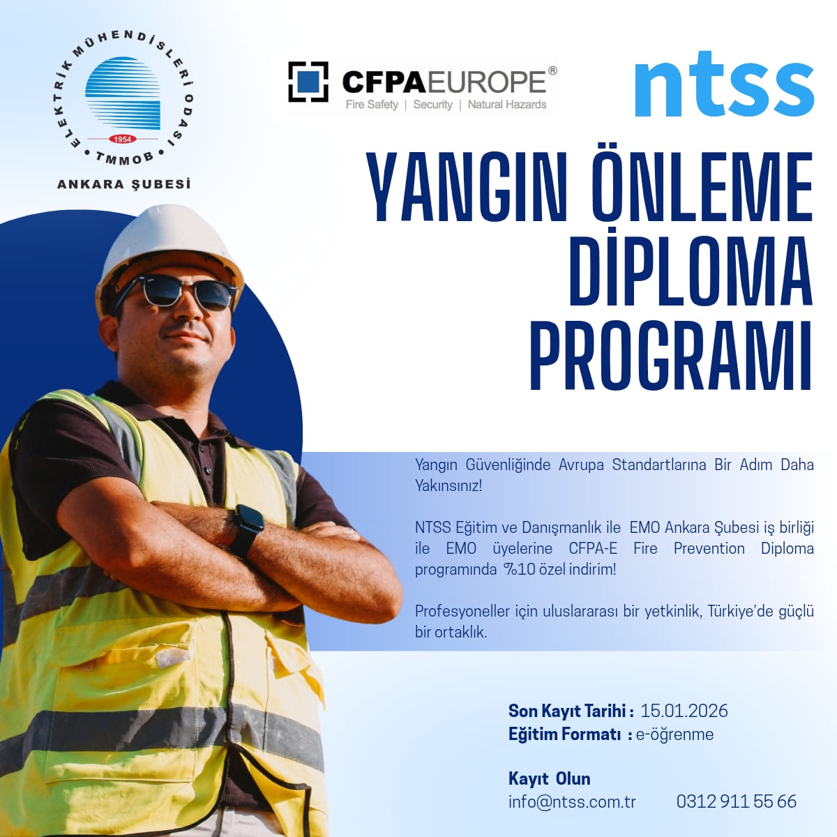 Elektrik Mühendisleri Odası (EMO) Ankara Şubesi ile NTSS Eğitim & Danışmanlık arasında yangın güvenliği ve iş sağlığı–güvenliği alanında nitelikli uzmanlar yetiştirmek amacıyla bir indirim protokolü imzaladı. Protokol kapsamında EMO üyeleri, Avrupa Yangın dan Korunma Dernekleri Konfederasyonu tarafından akredite CFPA-E Fire Prevention Diploma (Yangın Önleme Diploma Programı) için %10 indirim ile kayıt olabilecek.