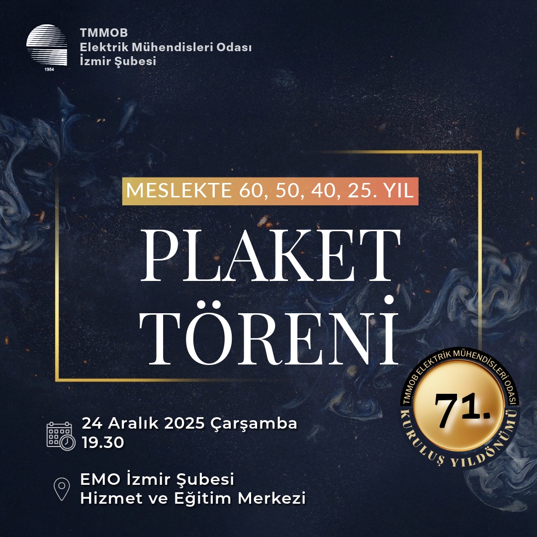 PLAKET TÖRENİ Tarih: 24 Aralık 2025 Çarşamba Saat: 19.30 EMO İzmir Şubesi Hizmet ve Eğitim Merkezi Kazım Dirik Mah. Üniversite Cad. 374/1 Sk. No: 1 Bornova - İzmir Konum