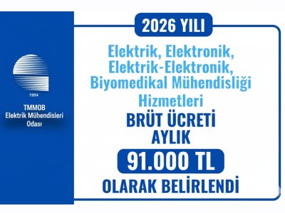 Elektrik Mühendisleri Odası (EMO) Yönetim Kurulu, Elektrik, Elektronik, Elektrik-Elektronik, Biyomedikal Mühendisliği hizmetleri ücretinin 2026 yılı için brüt 91.000 TL/ay olarak belirlenmesine karar verdi. Serbest mühendislik bürolarında ücretli çalışan üyeler için de bu ücret uygulanacak.